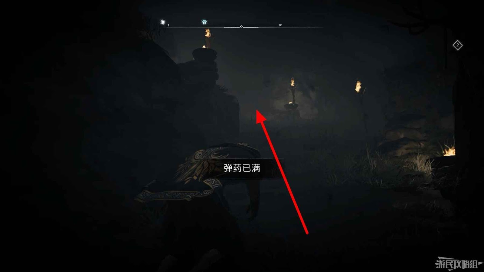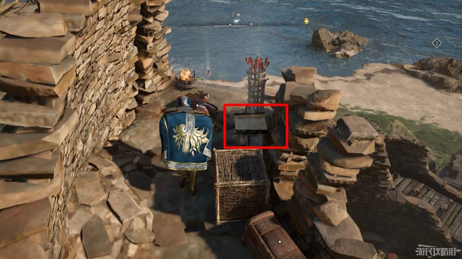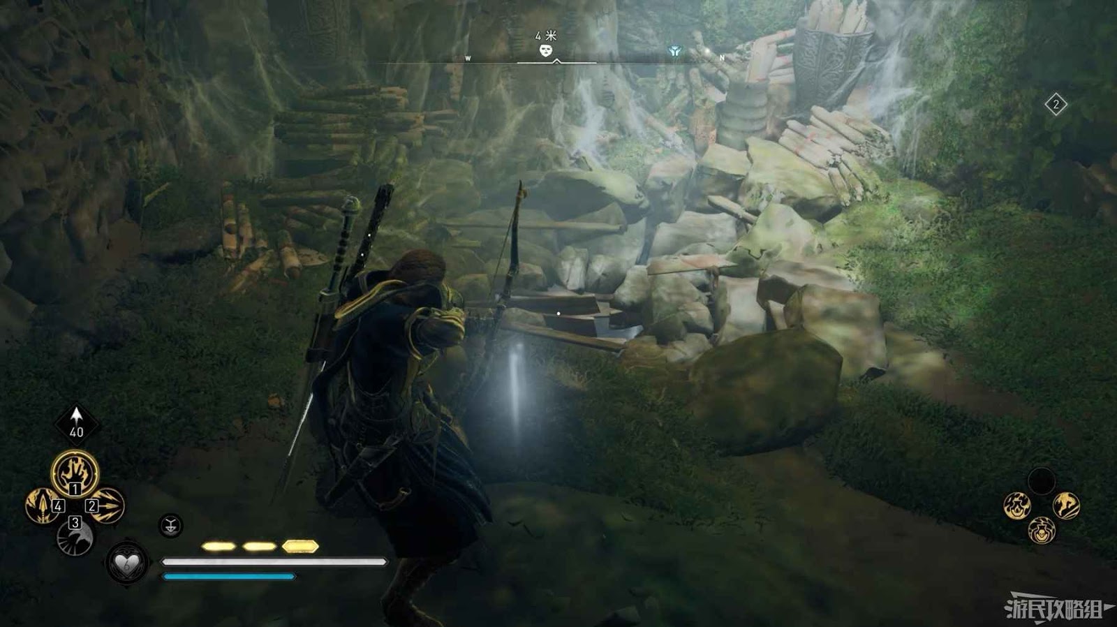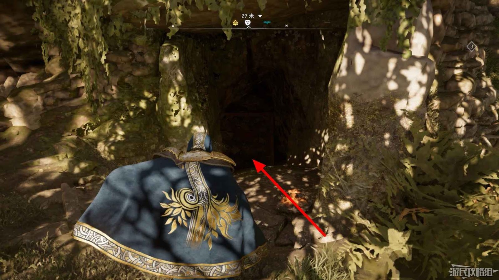 詛咒標記位於崖壁上的一個洞穴中,爬上另一側崖壁上的廢棄船隻處使用弓箭將詛咒標記破壞即可。