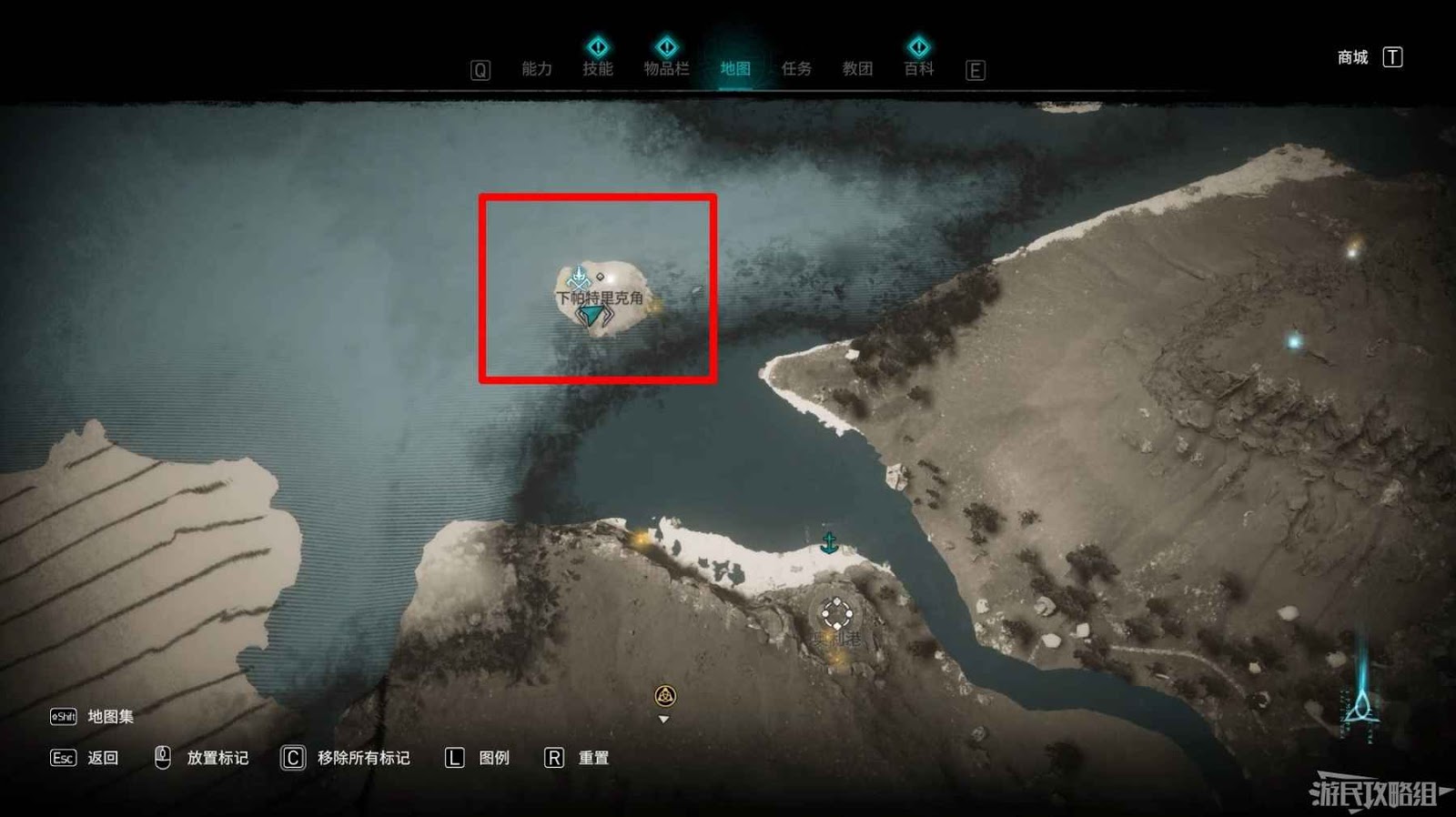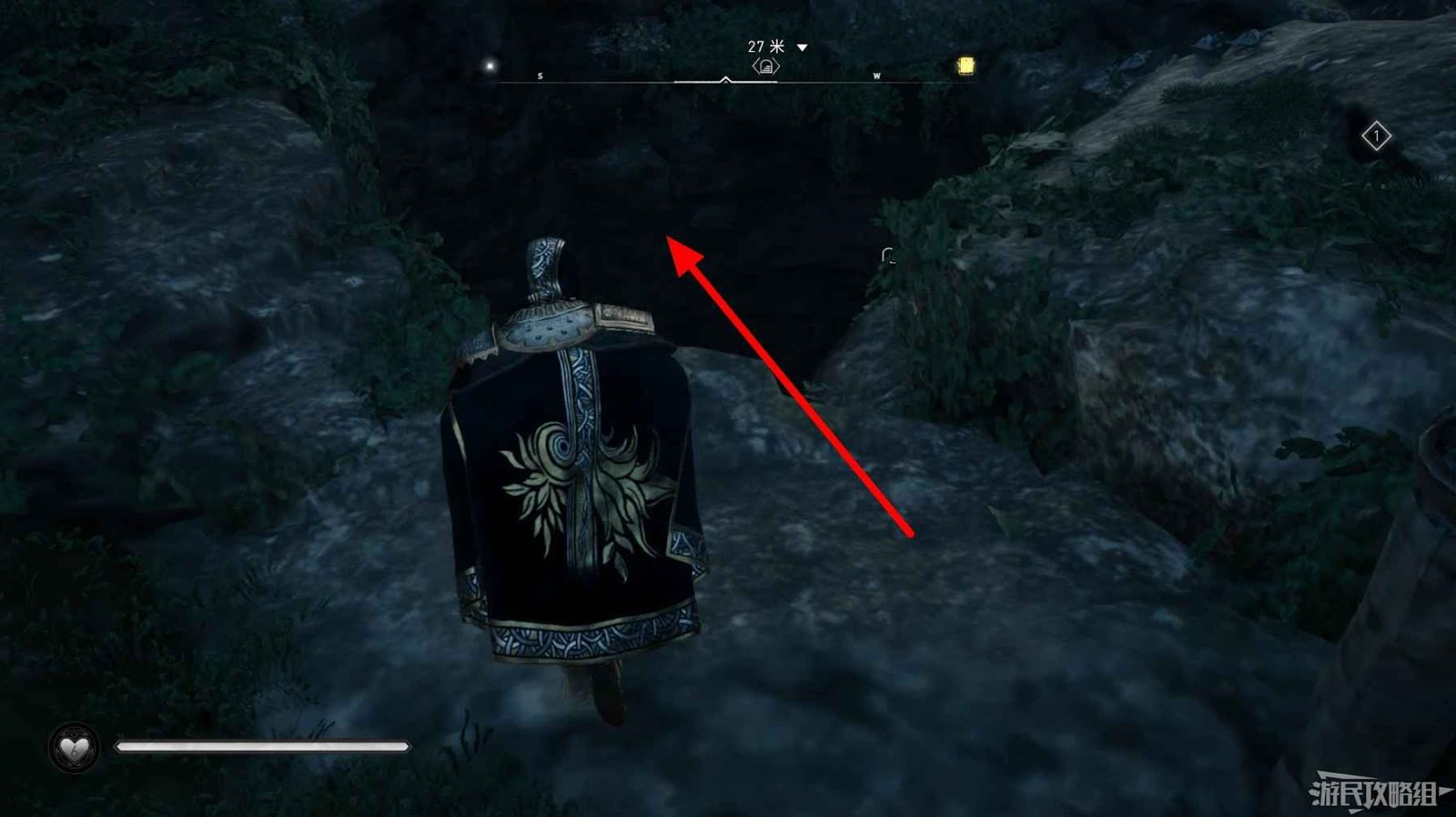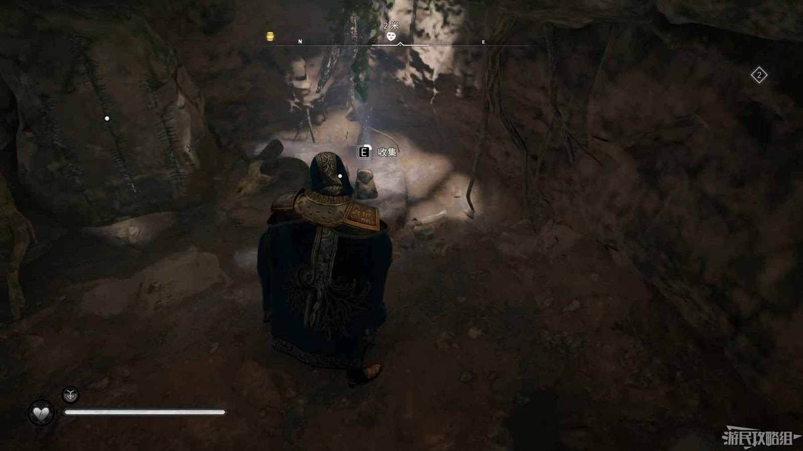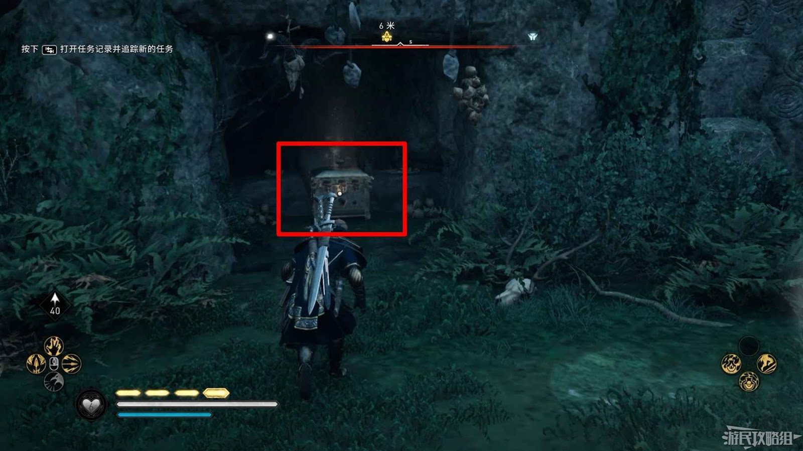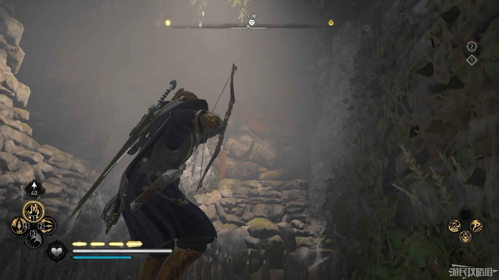 詛咒標記位於崖壁上的一個洞穴中,爬上另一側崖壁上的廢棄船隻處使用弓箭將詛咒標記破壞即可。