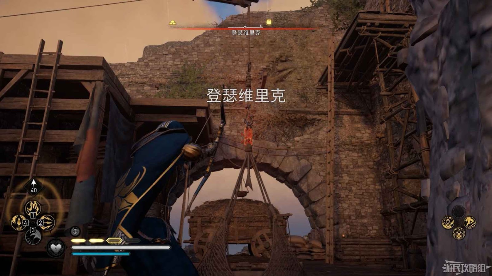 來到房屋屋頂破壞懸掛巨石的鎖鏈。