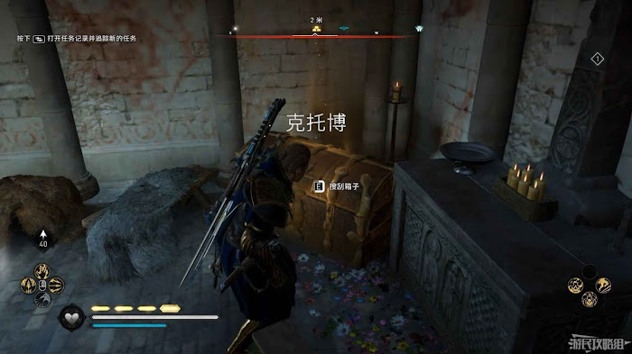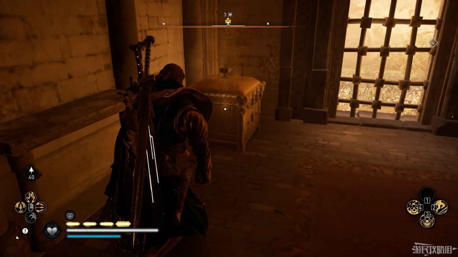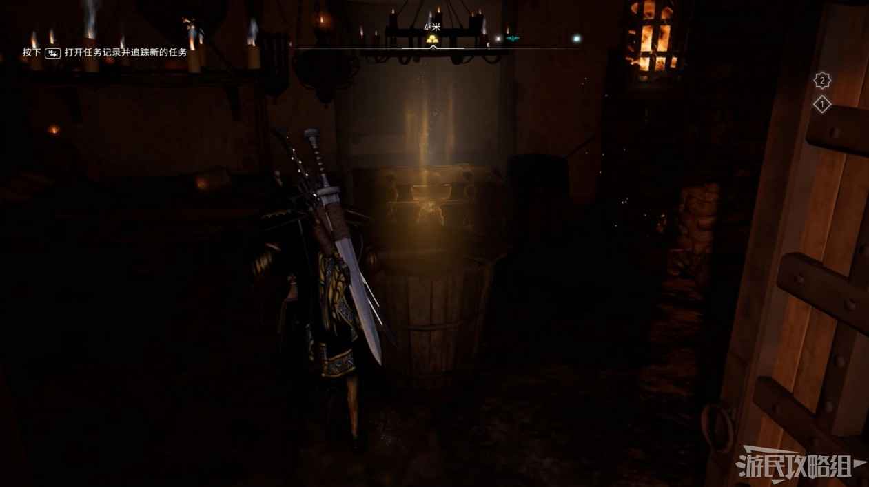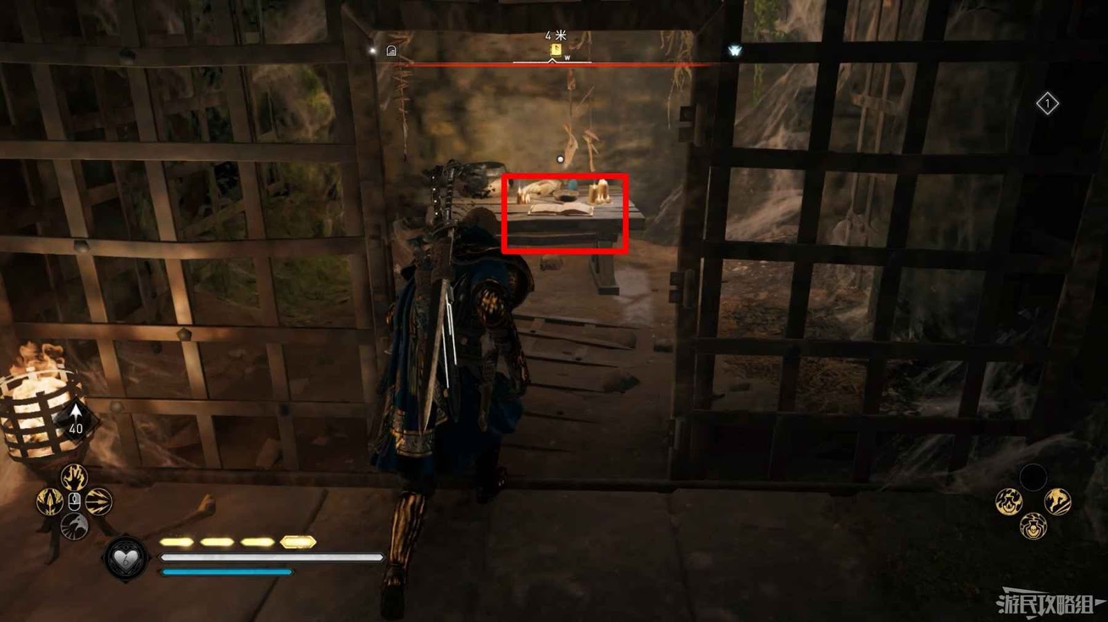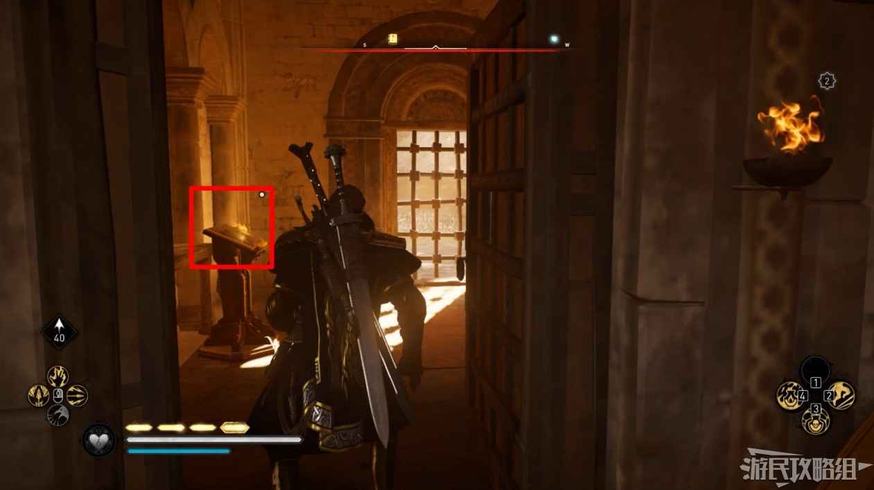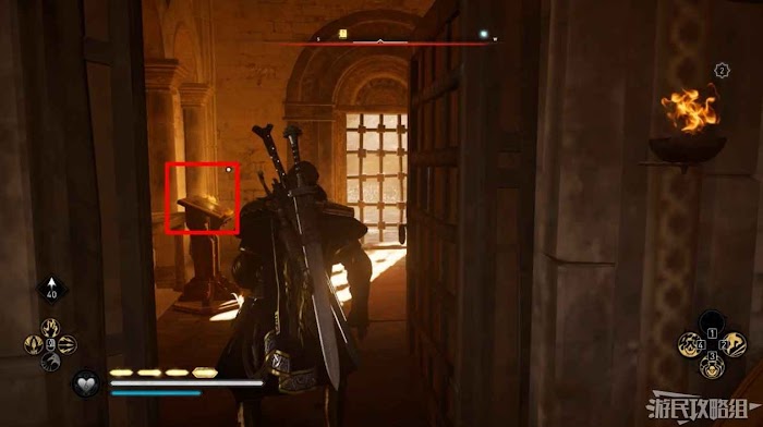 通過地板上的柵欄使用弓箭破壞地牢的門閂,返回地牢進入房間打開寶箱可以獲得凱爾特頭盔。