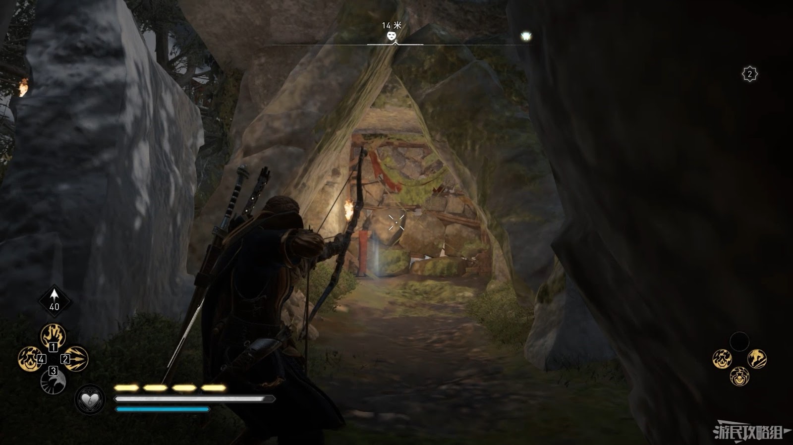 使用爆炸箭矢破壞陵墓牆壁。