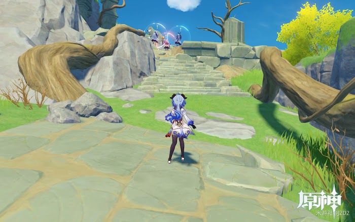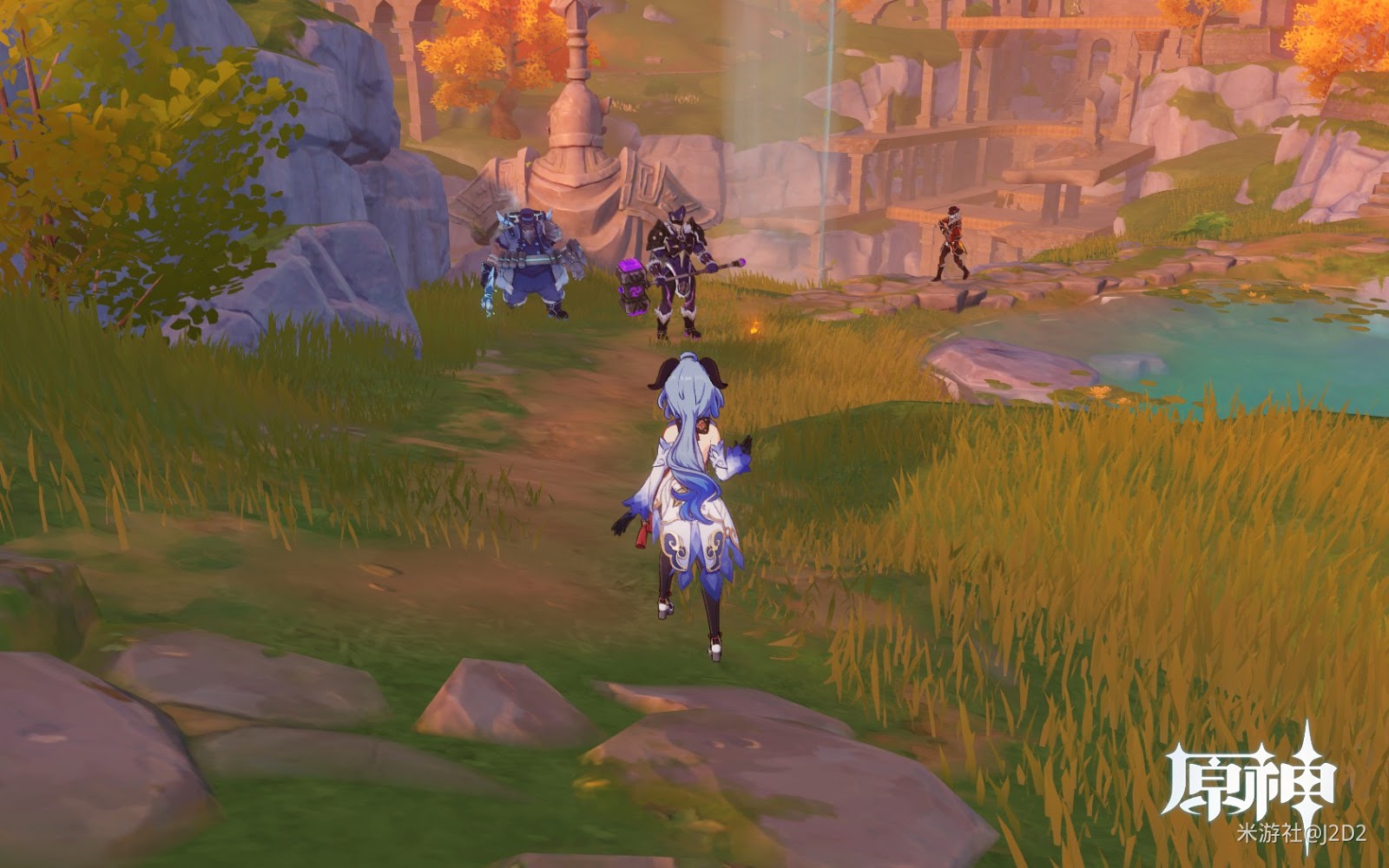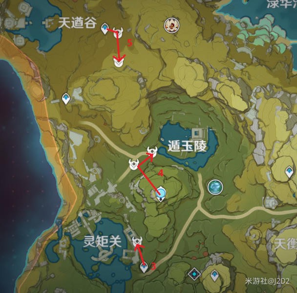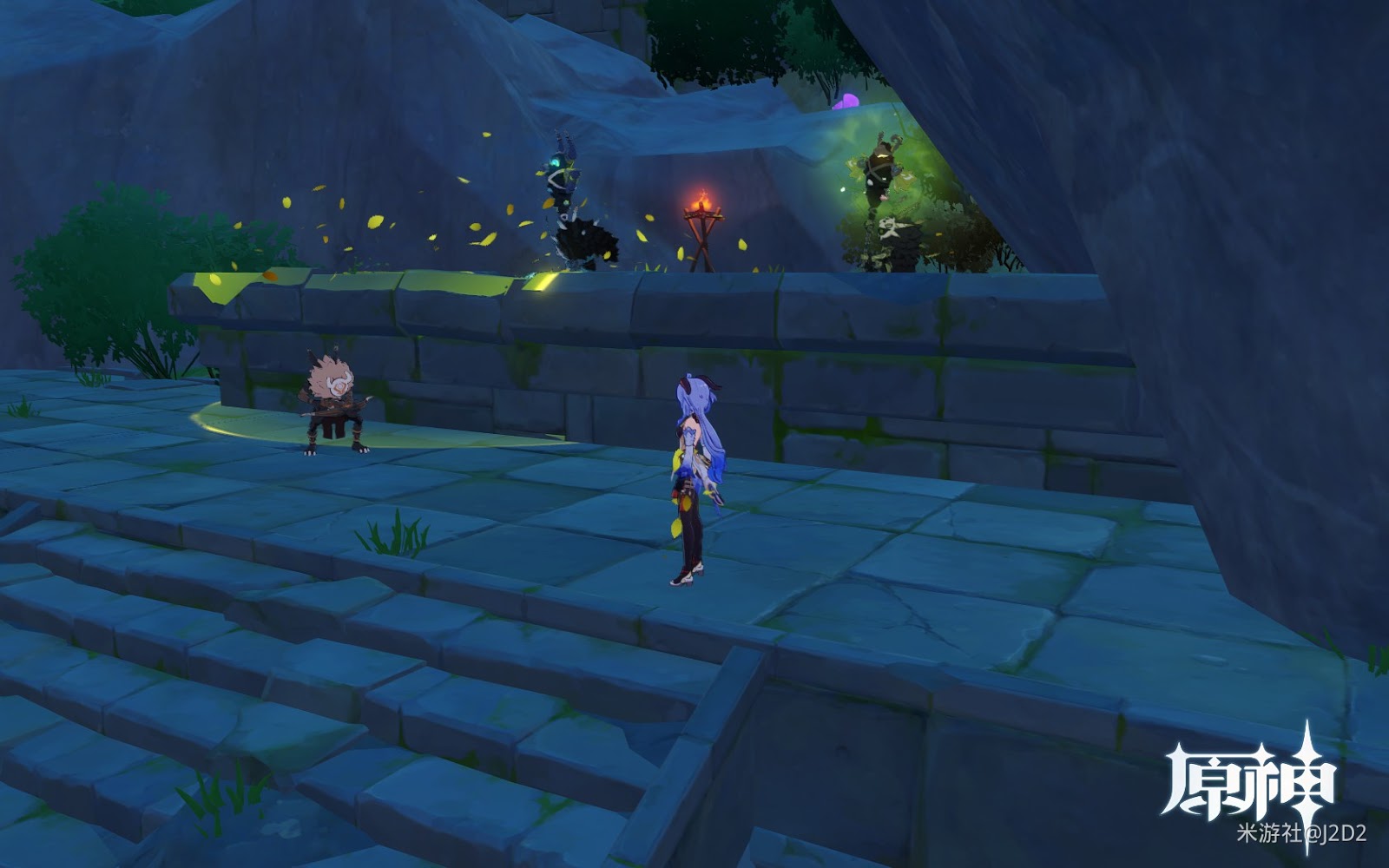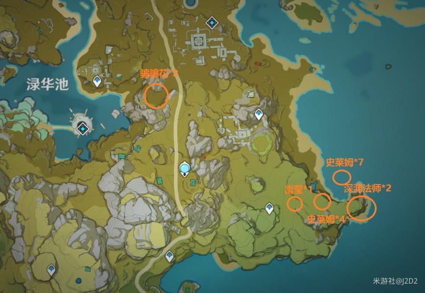1. 傳送到副本門口,往地圖左側走,出門後左轉上山即可看到三深淵法師(水、冰、火),利用風系擴散破盾或帶對應屬性破盾。副本門口可採集樹脂合成材料晶蝶。