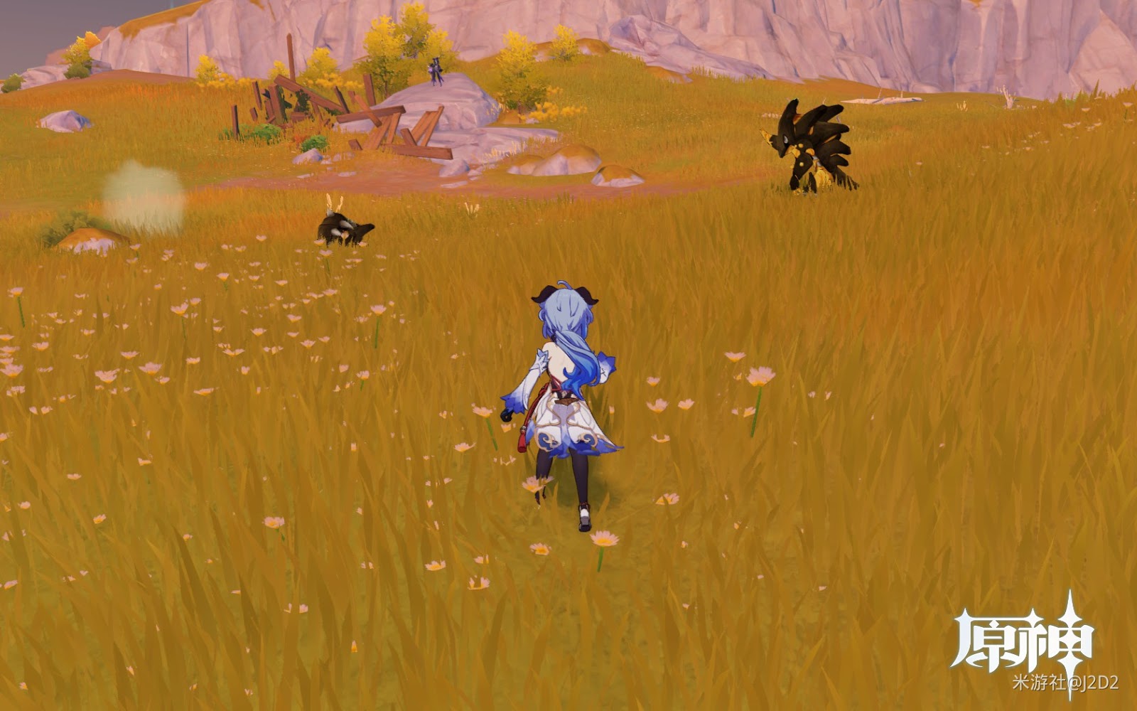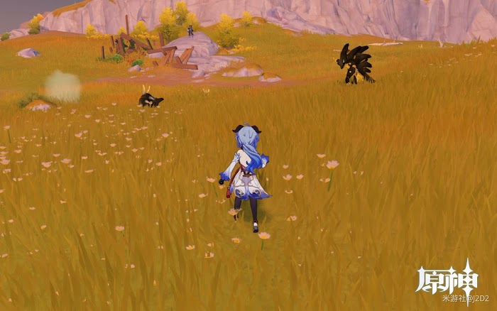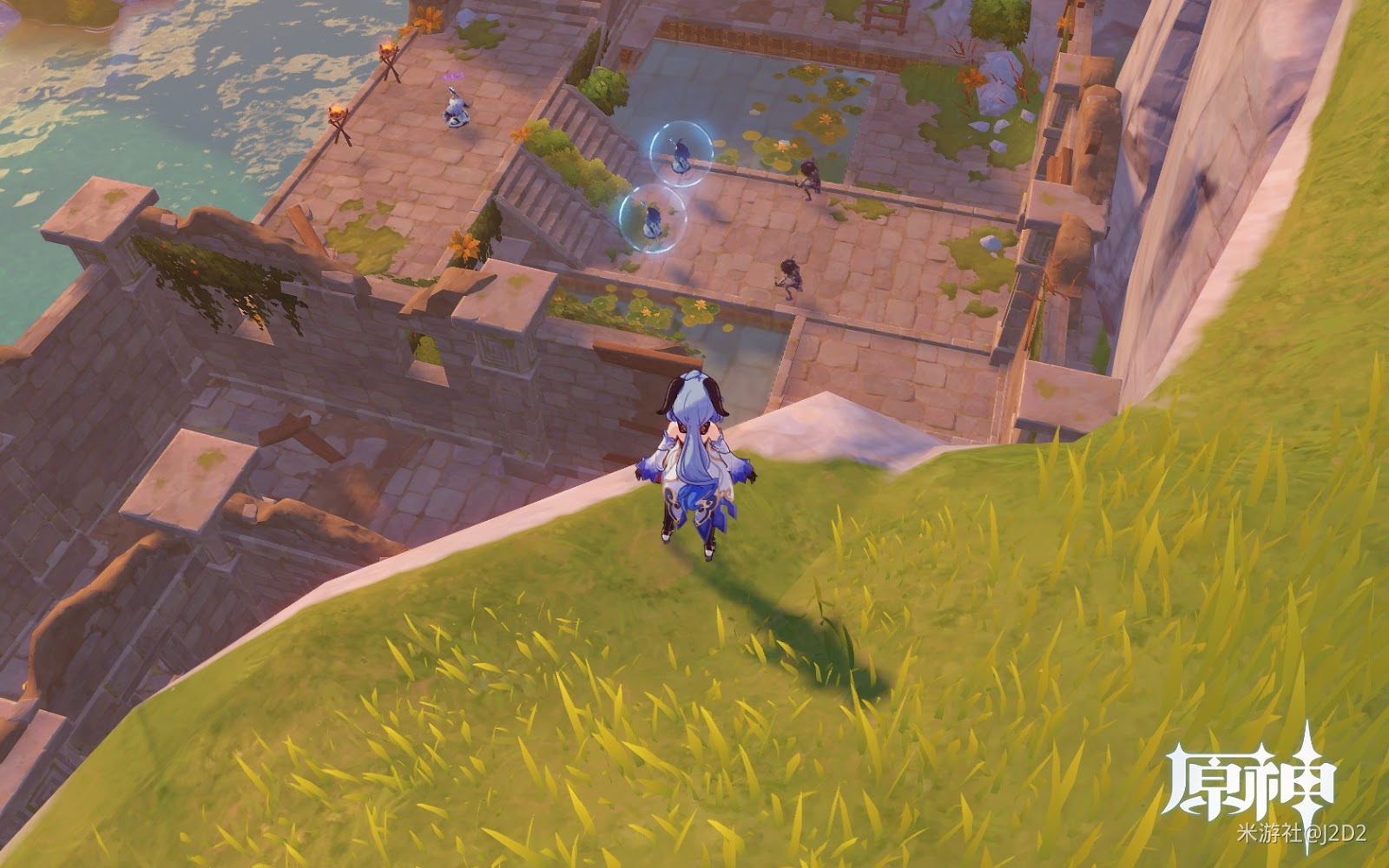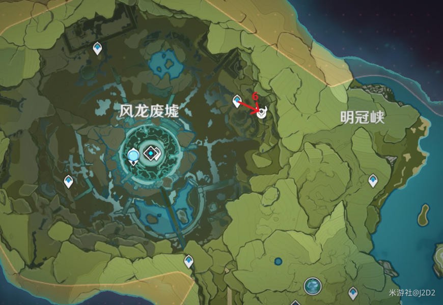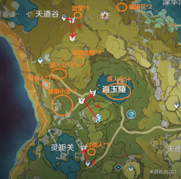 3. 傳送後往地圖上方方向走,注意不要跳下左側的山崖,在標記點會遇到1討債人。擊殺後走到左側山崖邊,即可看到3深淵法師+2丘丘人弓箭手。甘雨、安柏等遠端弓箭手站在山崖上射就可以了。如果沒有甘雨,帶上破盾角色下去直接打即可。