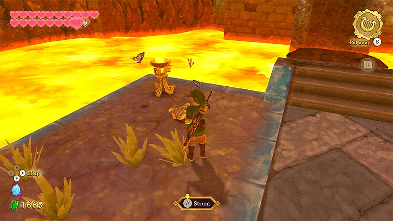 位於奧爾丁火山。前往大地神殿左側,利用噴湧的蒸汽飛上高台,找到神聖鳳蝶並彈奏女神豎琴。