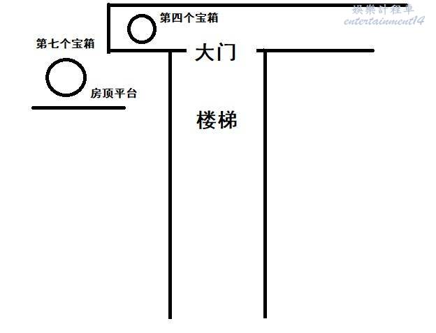 由於沒撿也忘記截圖了就這樣簡單畫個圖吧,能理解就行。首先跟著劇情流程把中間的平台升上去,然後直接飛到最下面的兩個機關處,把中間的轉盤樓梯轉成左右連接狀態,然後通過樓裡的梯子到達右側門口,就可以直接從右至左拿到這個箱子了。
