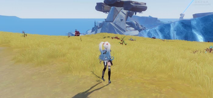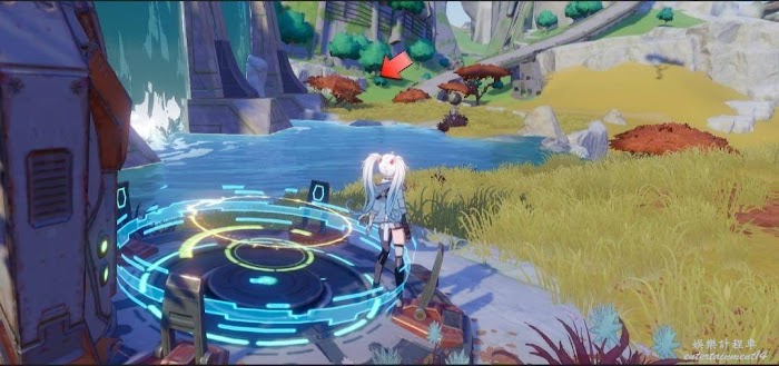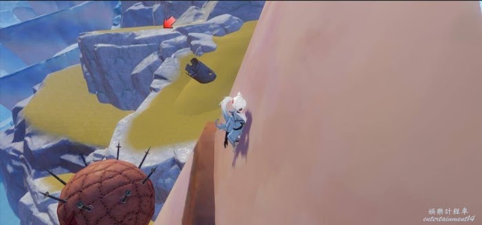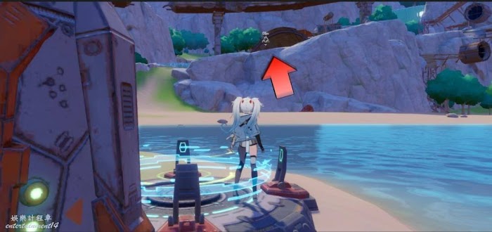 使用源器,將原能手炮炮彈打到腳下,生成原能柱,踩在原能柱上面,使用噴氣背包飛起來,然後爬到山上,一直爬就上去了