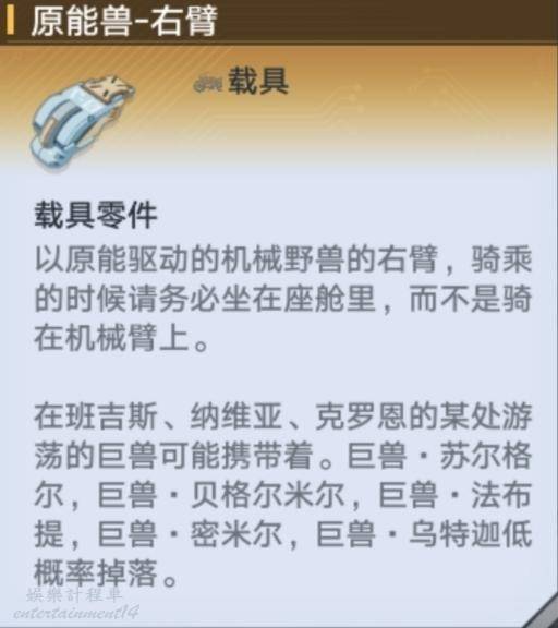 擊敗巨獸,低幾率掉落獲得:原能獸-右臂(這個也可以反覆刷,地圖上一共有五個巨獸,第一次擊敗後都有成就)