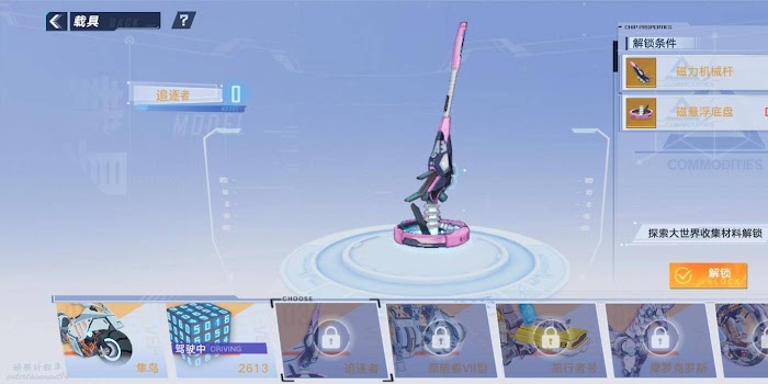 集齊追逐著的兩個零件,在主介面點擊右上角,再點擊載具,選中追逐著解鎖,即可獲得載具追逐著!