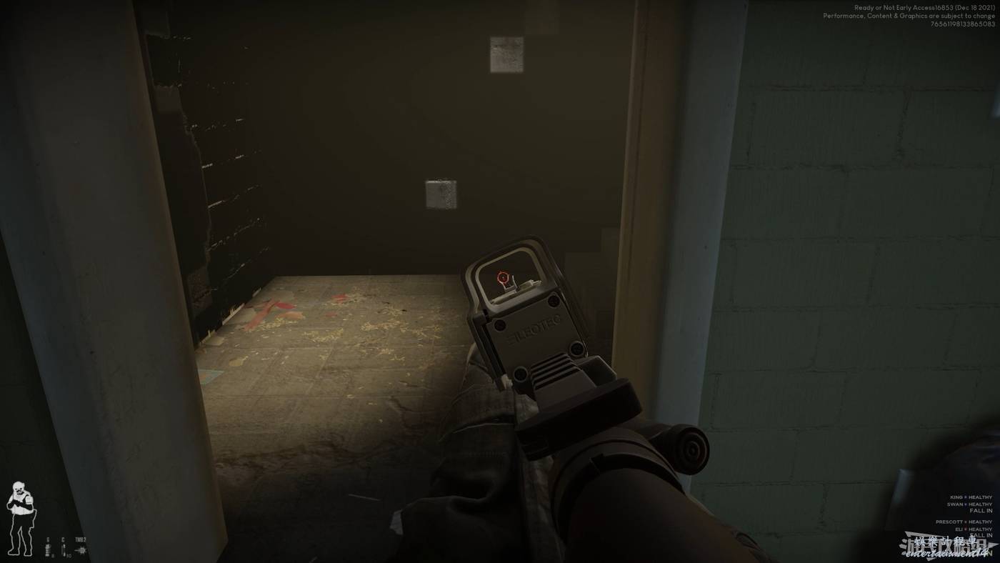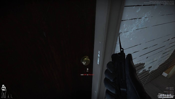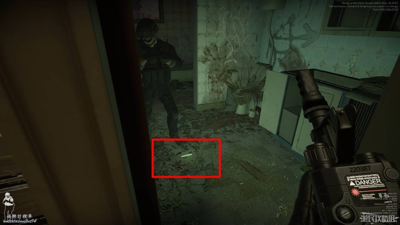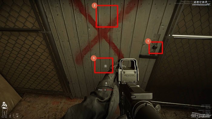 除了可以觀察門後環境和敵人位置外,我們可以在門右側查看是否佈置有陷阱。下圖所示即為佈置有陷阱的情況,陷阱一般為炸彈,但也有少部分情況會出現閃光彈。