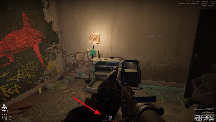 按X鍵可以切換武器的開火模式,【SINGLE】為單發模式,【FULL AUTO】為全自動模式。哪個模式旁的子彈圖案為紅色,則代表當前武器為哪種模式。長按X鍵可以將武器保險關閉切換至【SFAE】模式,此狀態下點擊開火鍵將無法開槍。