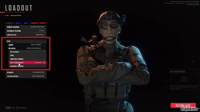 頭部裝備自上而下分別為無裝備、夜視儀、防毒面具、閃光護目鏡和防彈面具,因為在進攻歹徒所在房間時我們會頻繁使用閃光彈,所以其中小編人為最為實用的是閃光護目鏡。在對人組隊遊戲時玩家也可以根據隊伍分工不同自行調整裝備配置。
