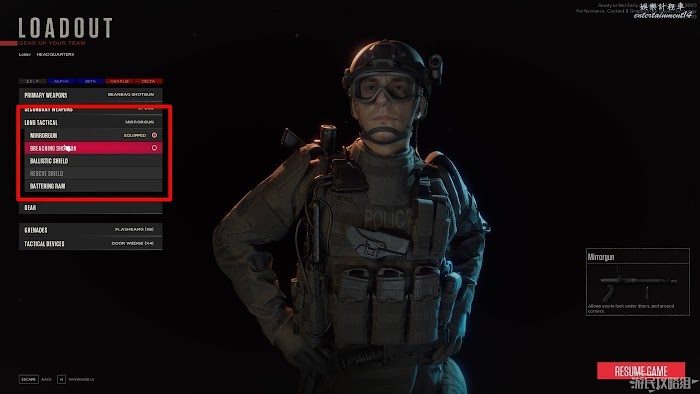 第三個選項為戰術裝備清單,自上而下分別為探鏡、破門霰彈槍、防爆盾和撞錘。