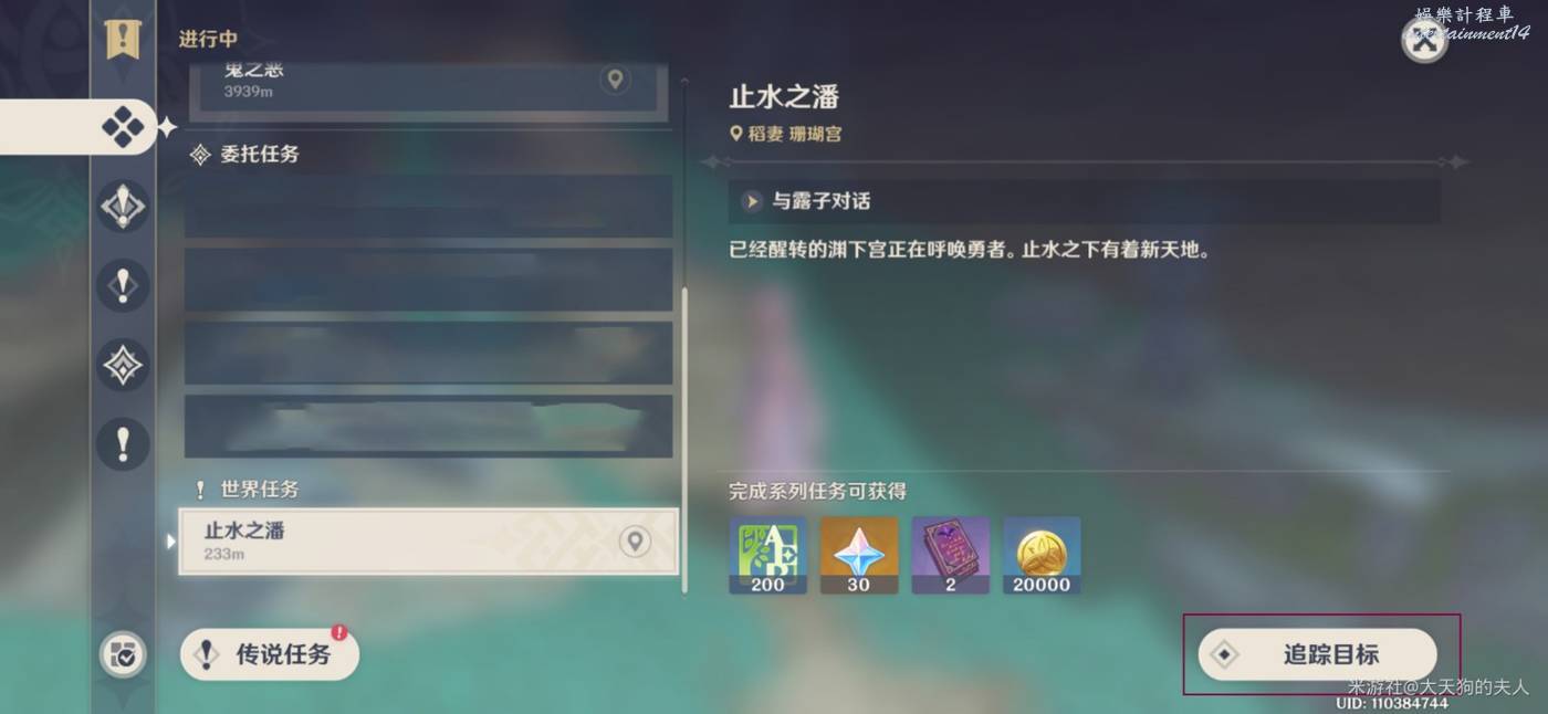 完成稻妻主線任務第二章第三幕以及世界任務「月浴之淵」後,世界任務「止水之潘」會出現在任務列表裡。
