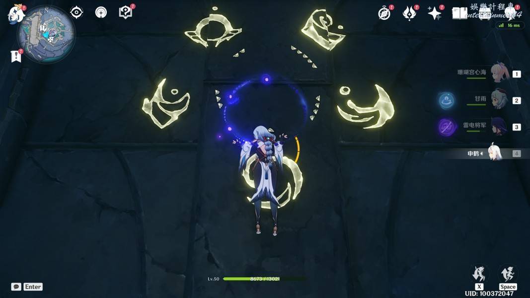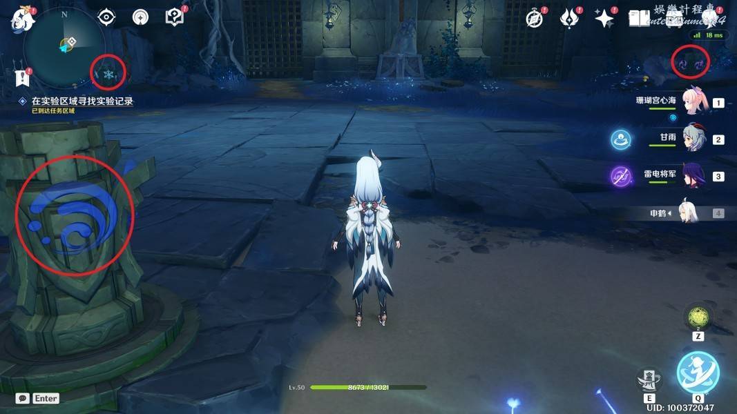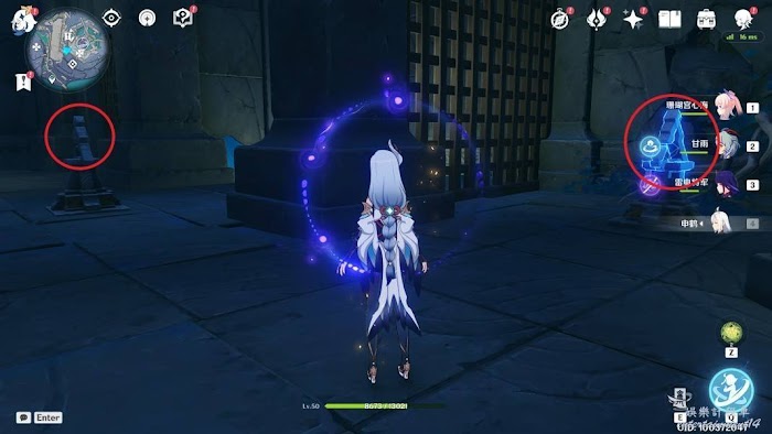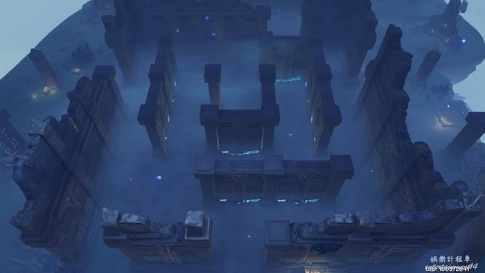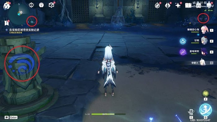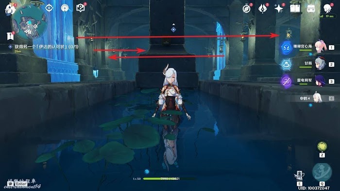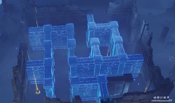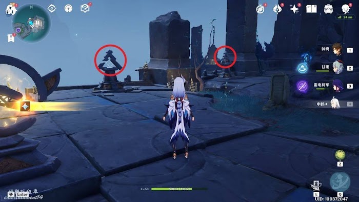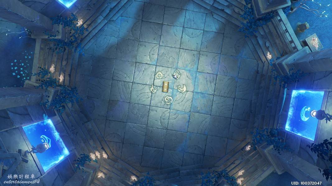 如圖所示,前往四處發光點,用水元素啟動方碑即可