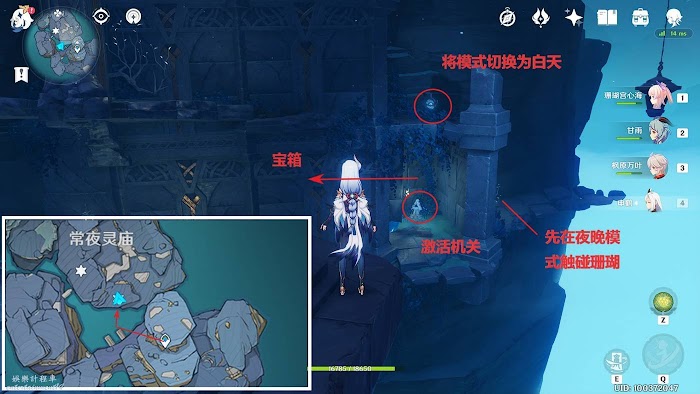 先在夜晚模式,觸碰右邊牆後的珊瑚,在切換至白天,進入攻擊機關,寶箱在左手邊