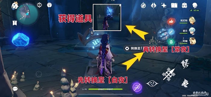 7、此刻發現周圍都是屏障,先把身邊的日月機關轉換至【白夜】然後把前面的日月機關轉換至【常夜】即可獲得藍色道具
