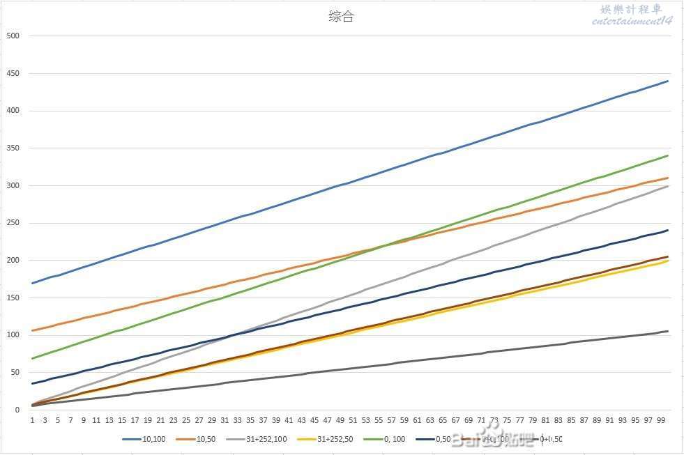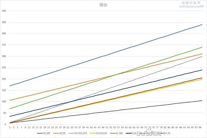 以下是一些資料的比較。只計算除HP的能力。以種族值50和100作顯示。同時0加成和滿加成的比較,也可以比較一下同作高低種族,和新舊作能力對比。