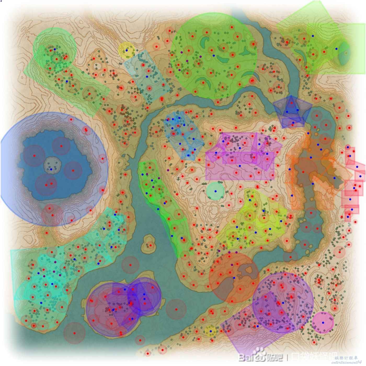 新作的PM生成機制,是在地圖設立一個個生成點。然後每個生成點各自有各自的PM生成機率,隨機在幅射範圍內生成。下圖為示例。