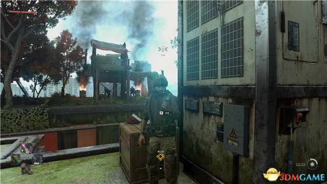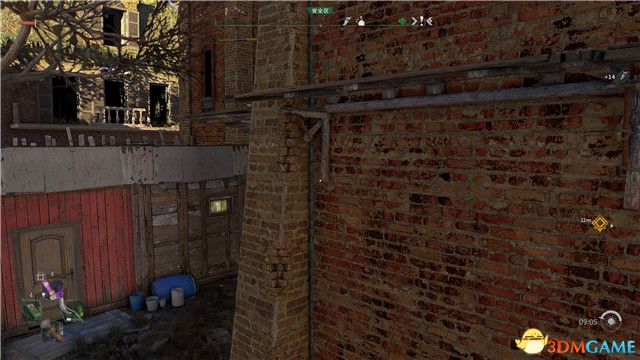 到達任務目標位置附近,找到建築物旁邊的一些矮建築。