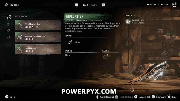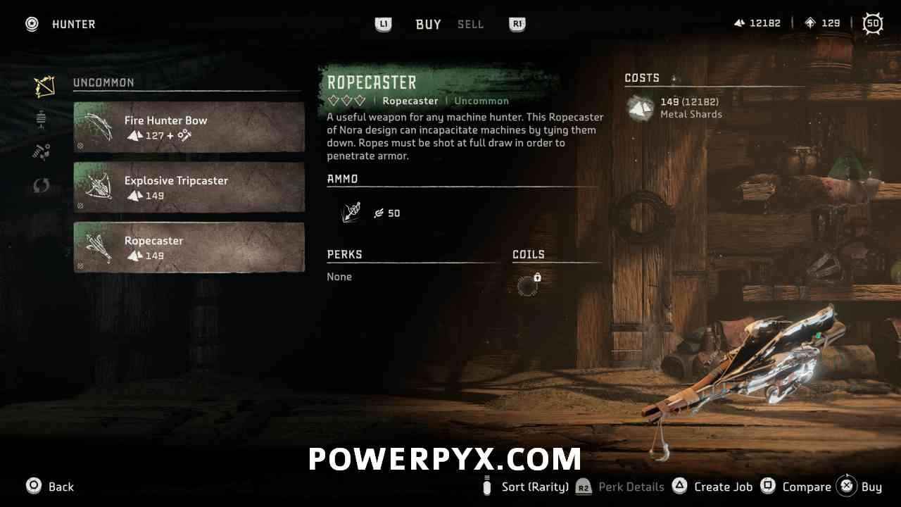 本作的武器總共有10類,包含長矛、獵手弓、戰弓、射手弓、爆破彈弓、絆線槍、繩槍、射釘槍、爆破槍和粉碎護手。每類武器都有幾把武器,稀有度從綠(不常見)到橙(傳奇),橙色(傳奇)是本作中稀有度最高的武器。每種武器都有不同的元素效果並使用不同的彈藥。大多數武器都可以直接從獵人(狩獵商品)處購買,少數是完成任務或收集的獎勵。想製作彈藥的話需要消耗資源,稀有的彈藥製作資源可以從資源回收承包商處購買。