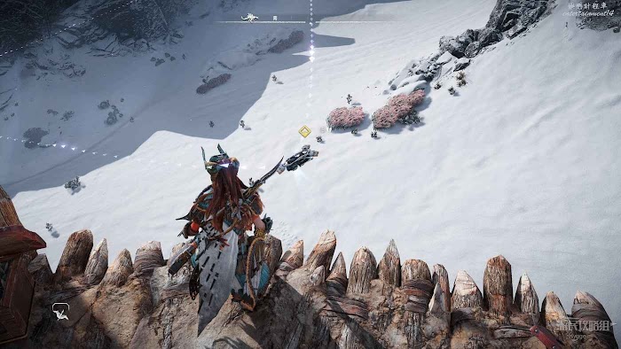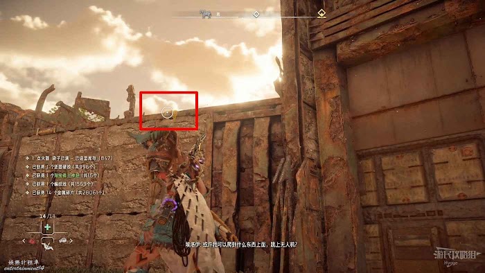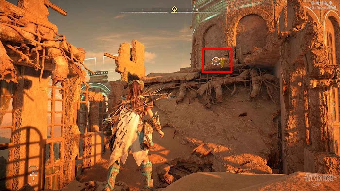 我們在無人機活動的範圍內的大樓廢墟上可以找到一根伸出建築的橫樑,我們可以通過騎乘日翼者直接來到樓頂,或通過大樓上設置的攀爬點爬到此處。