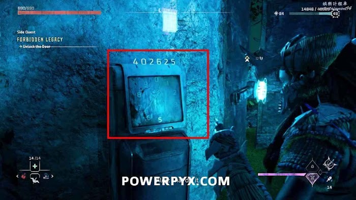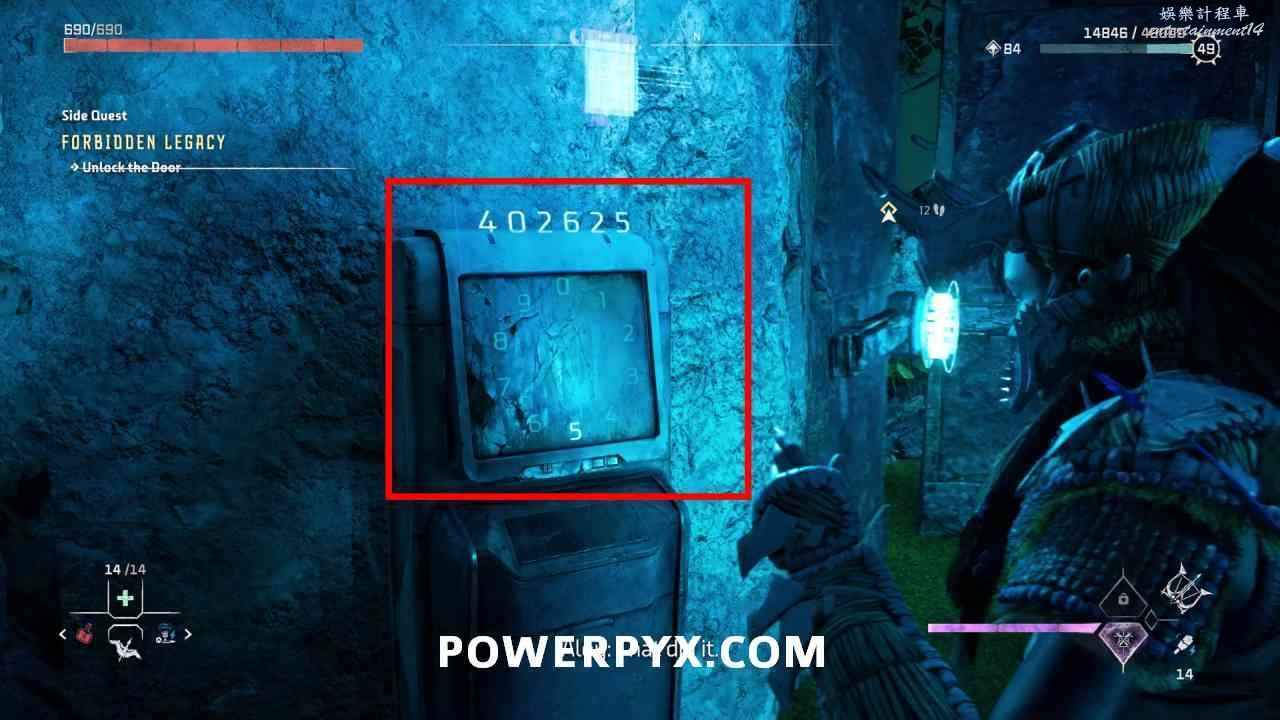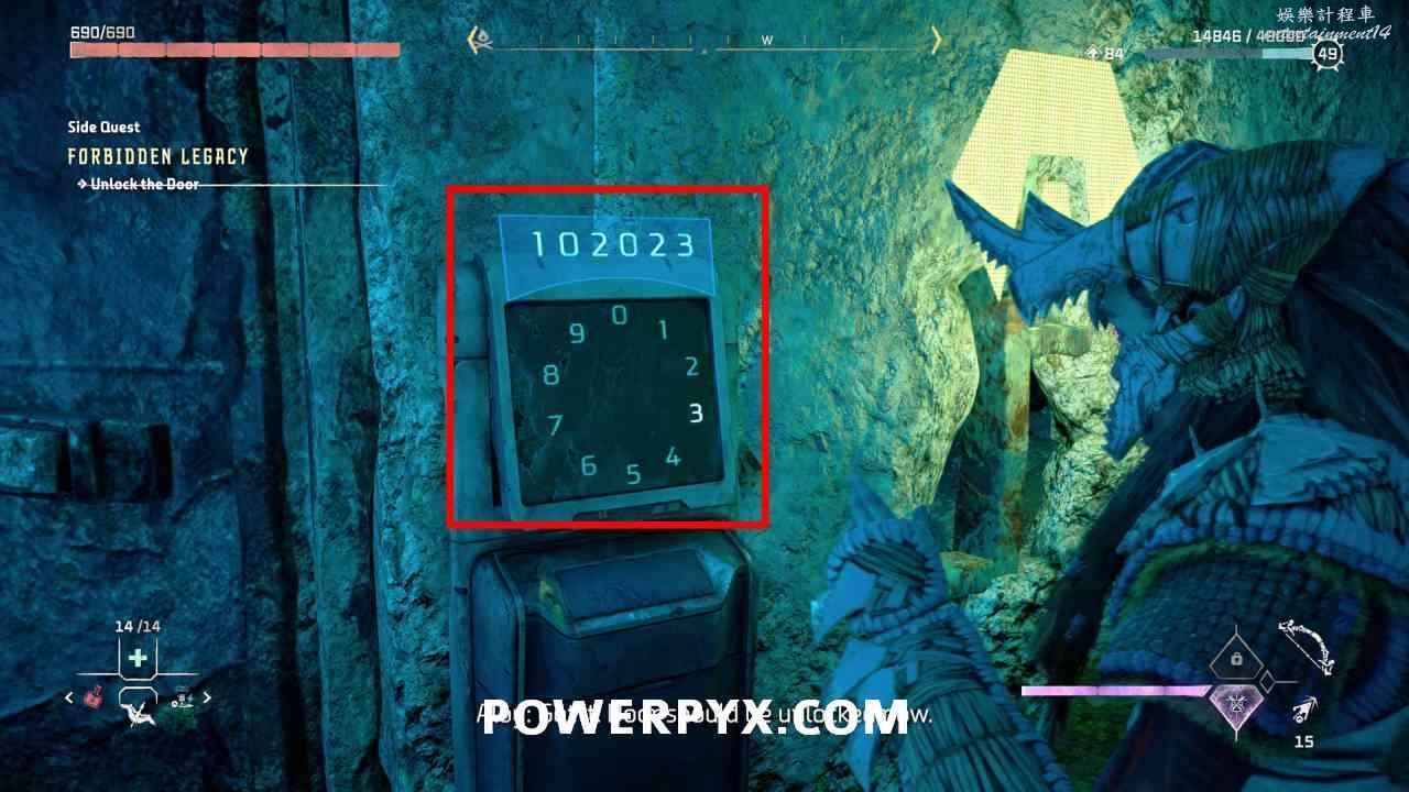 第一道門的密碼為102023。位置在跳到塔上之後。