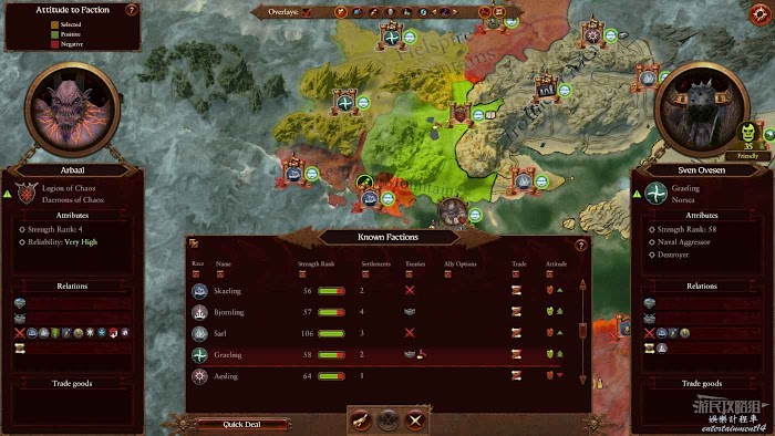 在盟友的選擇上,挑選適合我方的陣營作為夥伴並改善關係,之後就可以建造前哨並招募諾斯卡單位了。遇到其他惡魔派系的領主時(斯卡佈雷德、納卡裡、庫嘎斯和卡洛斯),也要改善關係,這樣一來,即使惡魔神耀面板中尚未解鎖對方的兵種,我們也能通過前哨來招募其他混沌之神的單位。