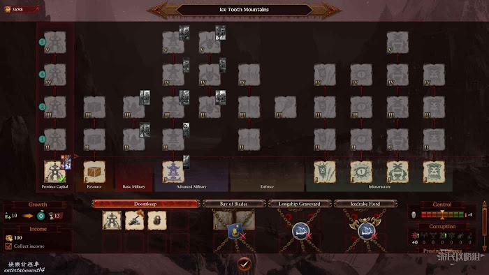 - 基礎建築:一共四條建築鏈。①提供發展並降低招募成本;②增加收入;③增加補員速率、神耀產量和腐蝕(後兩者取決於神),掌控力足夠高時還能增加收入;④提升掌控力並增加可駐軍單位。