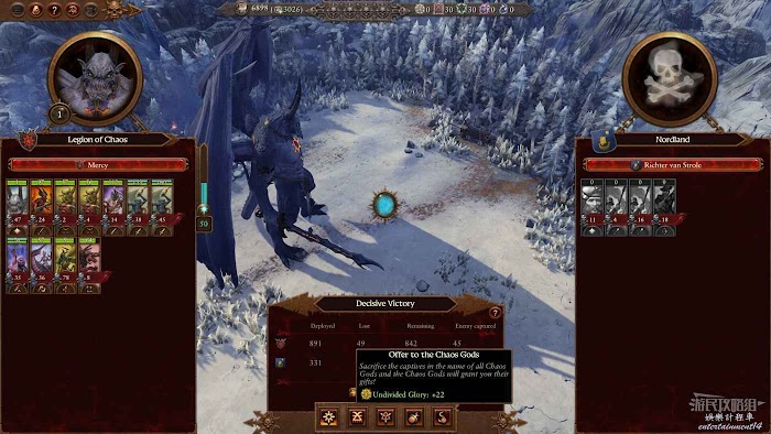擊敗敵人後,可以將俘虜獻祭給混沌四神中的任意一位(也可以選擇統合神耀)。之後佔領末日堡(可成為首都)時也可以進行獻祭。