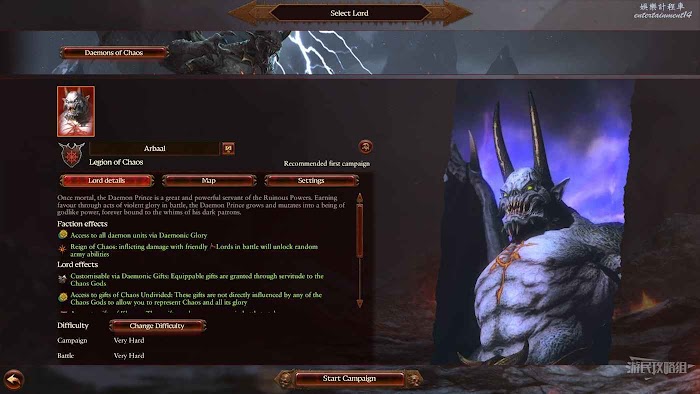 作為混沌惡魔,惡魔親王會默認與其他所有秩序陣營交戰。遊戲開始時首先要和初始地周圍的一些秩序派系打交道,之後諾德領可能會橫渡大海來入侵我們,再之後基斯裡夫也可能向我們發起進攻。