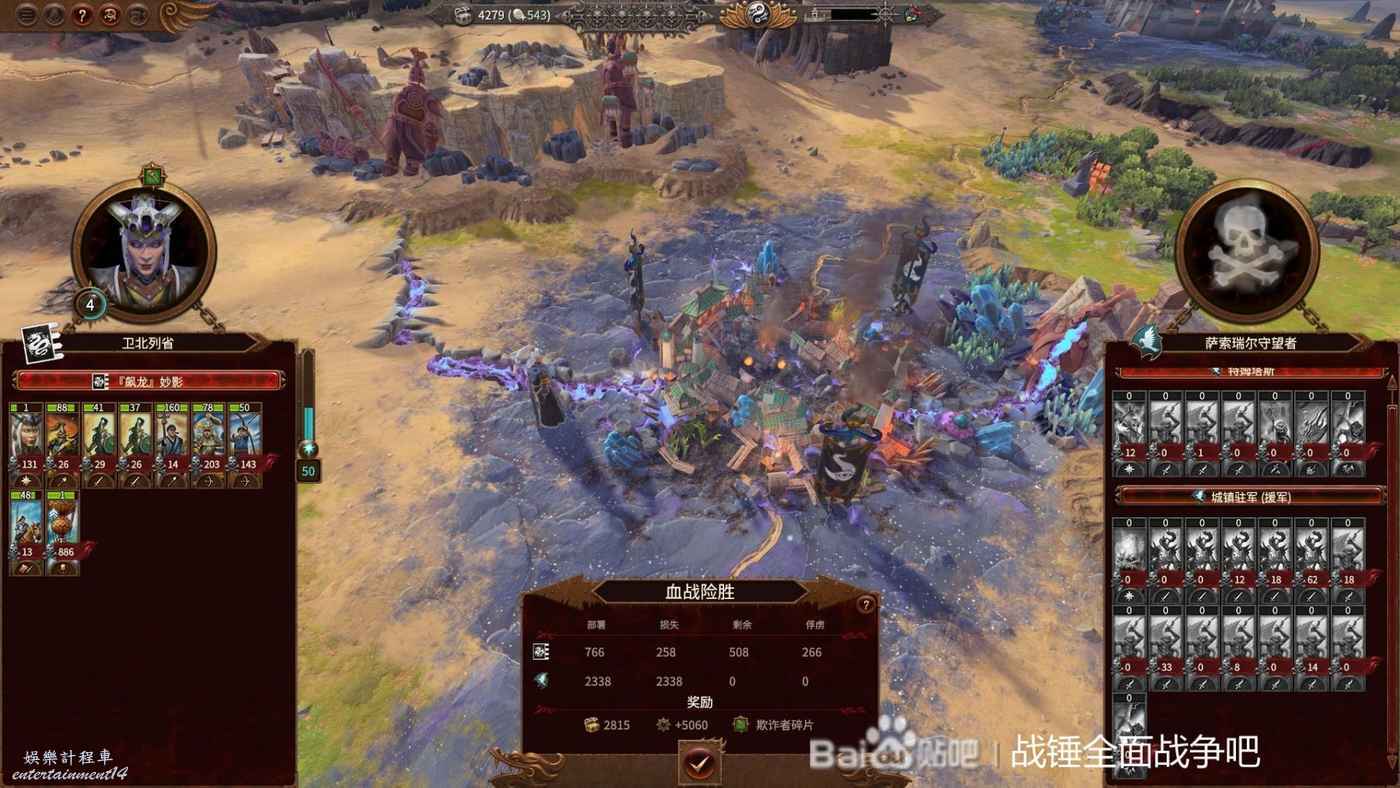 3.當你發現敵人只剩幾隊龜在其他據點裡不動的時候,就進入最後的殘局階段了。你把剩餘的部隊抱團,沖向敵人的領主,妙影斬將即可。如圖。我在影片裡演示的時候,由於敵人亂跑導致妙影總是砍不中,所以影片中打得傷亡略大了一點,不是特別好。這一代AI很喜歡亂動。也可能只是奸奇的AI喜歡亂動。