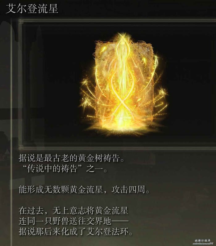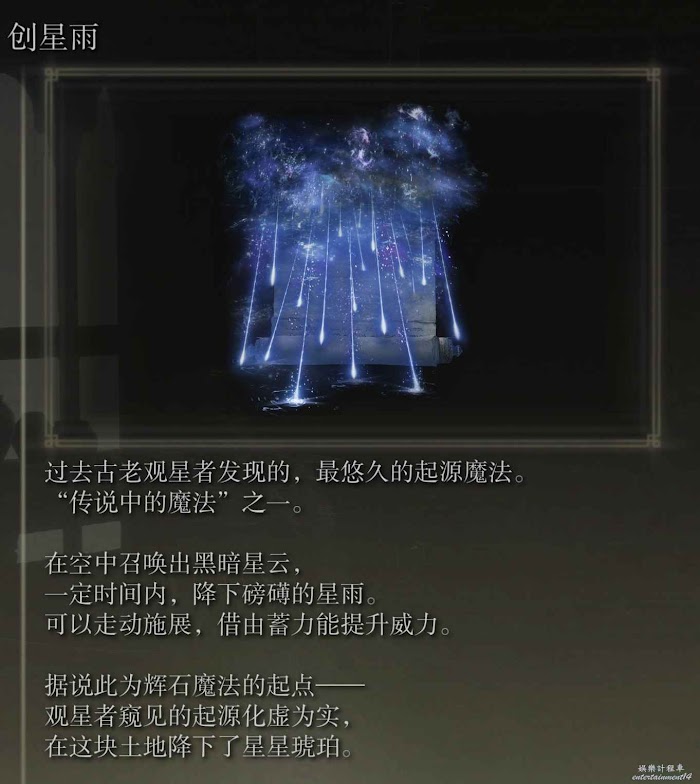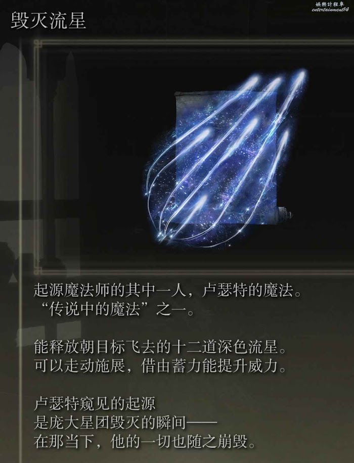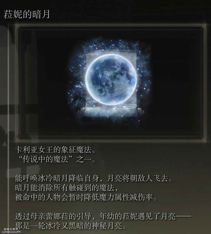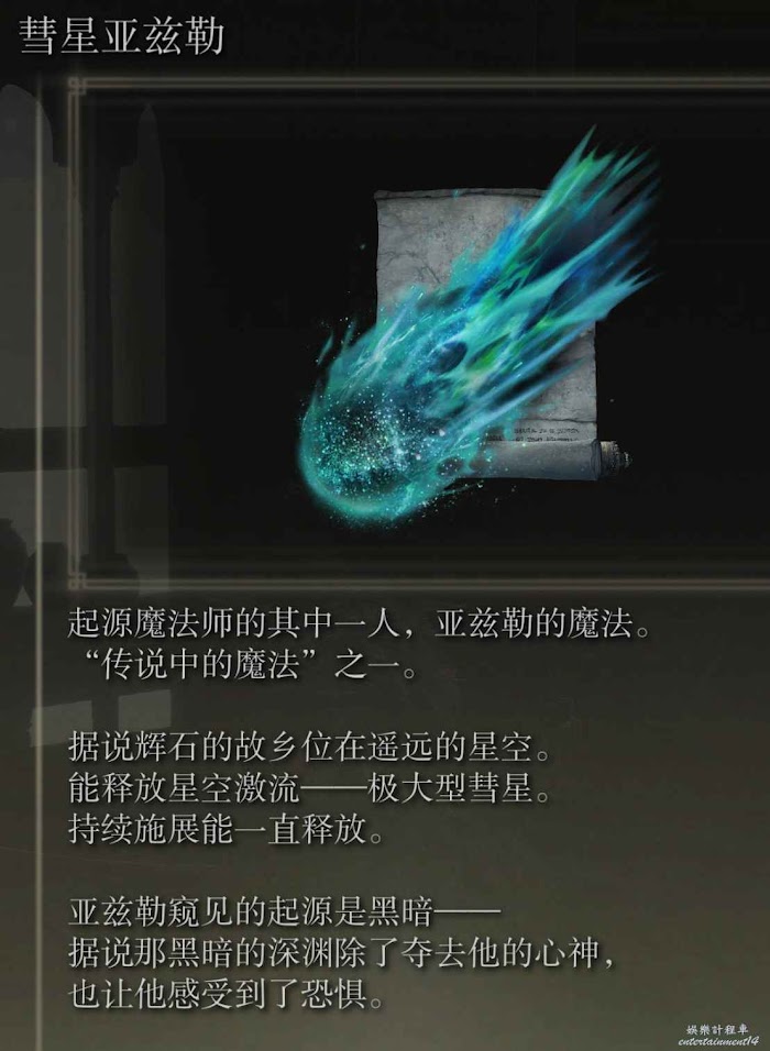 由菈妮任務線最後一步時到達的區域獲得,解密第二張圖法師塔,方法為找到三隻隱藏烏龜(存在BUG,每找到一隻請回到篝火坐下,不然看不見下一隻)。