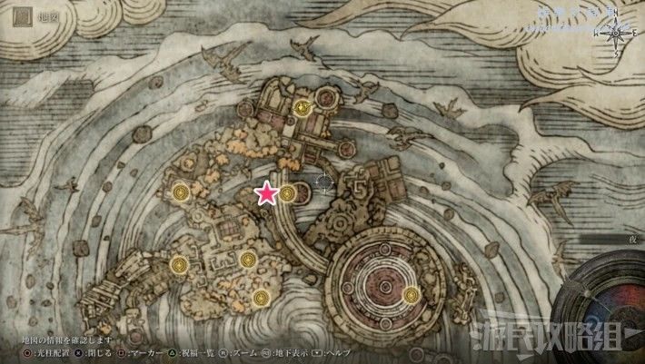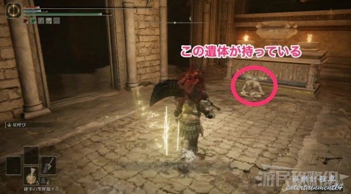 - 在賜福點「大橋側邊(逐漸崩毀的法姆·亞茲拉)」下一層有一具屍體(如下方圖片標記位置所示),此鈴珠就在屍體上。從龍教堂往山上走時要注意躲避雷擊。