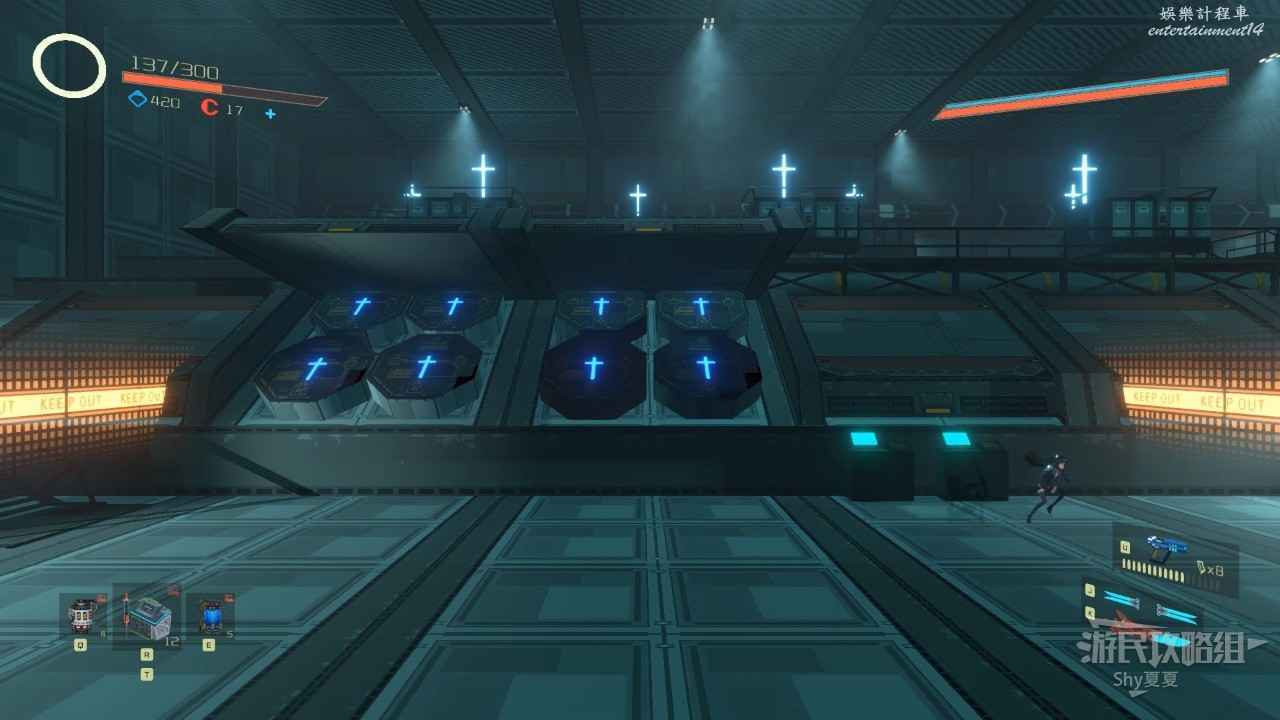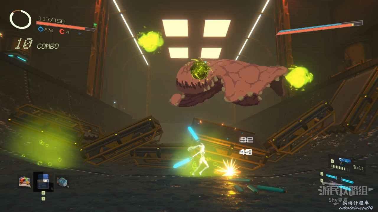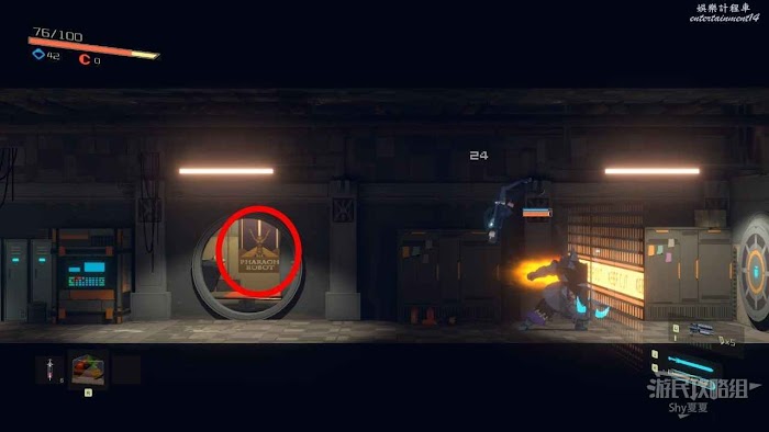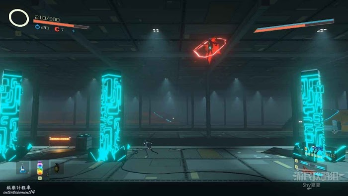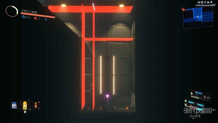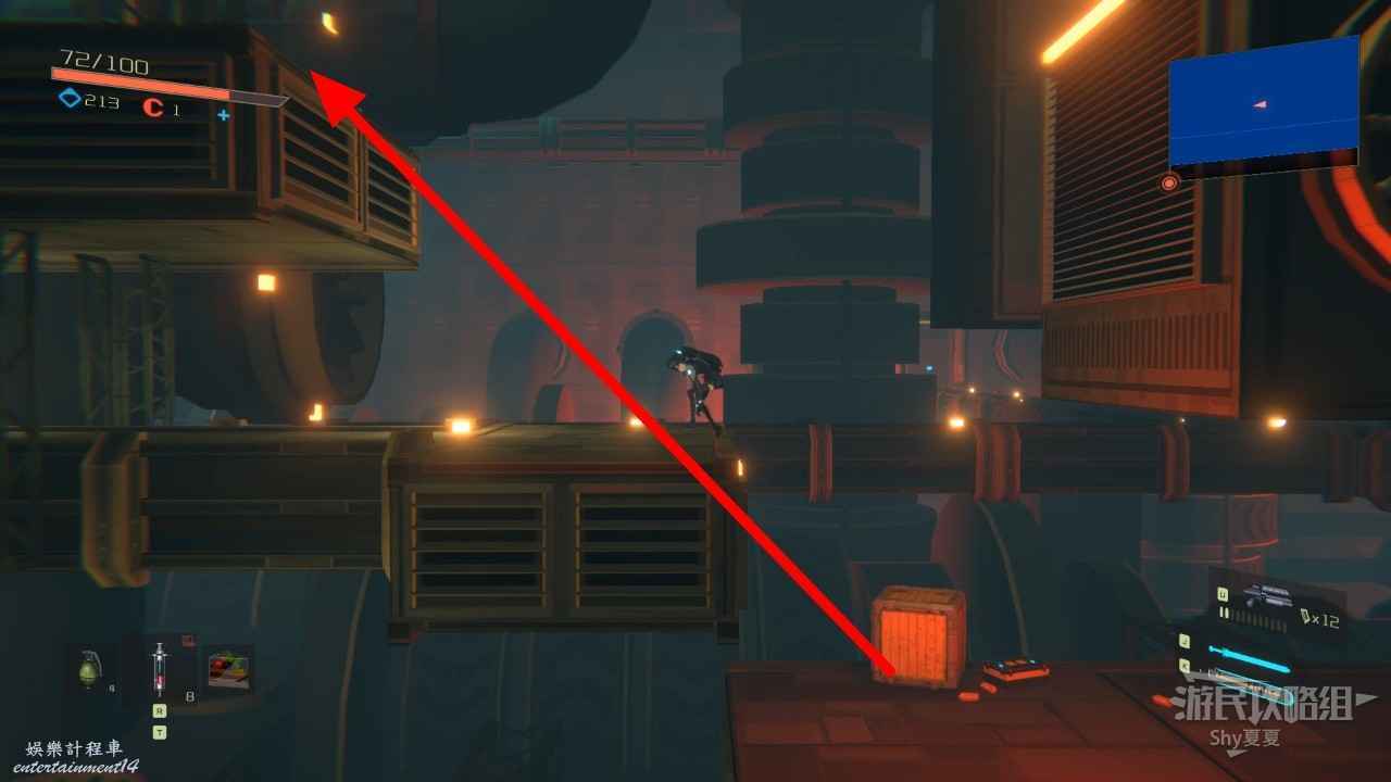 從【通道B1L4】前往資源室,路上會被紅球追殺,如果在接觸紅球前,反方向閃避,雖然會受到傷害,但是不至死,如果藥多可以利用此方法躲避,接著通過紅球的運動軌跡,躲避向上跳。