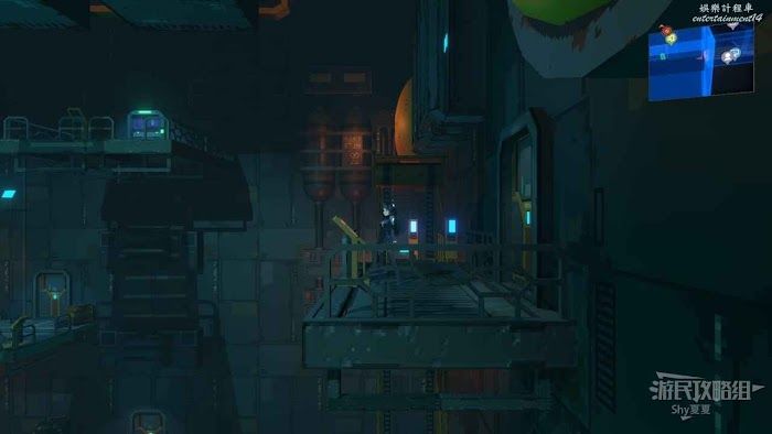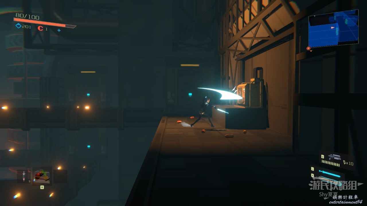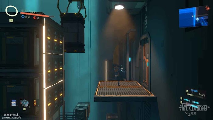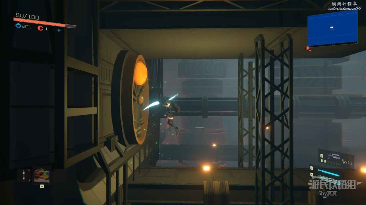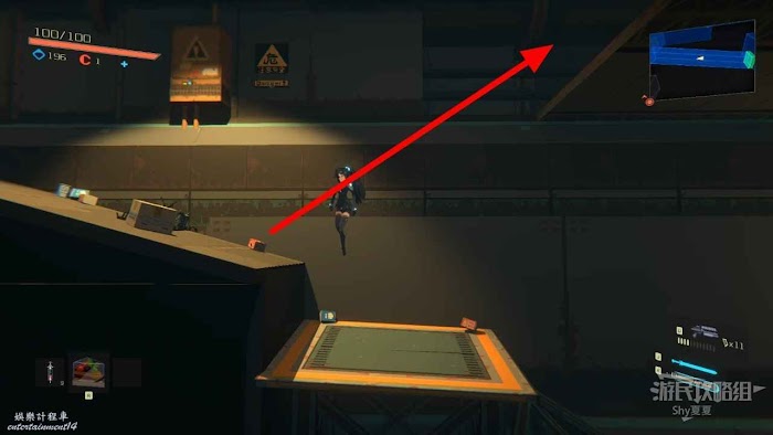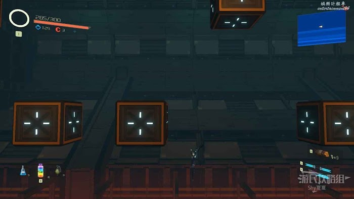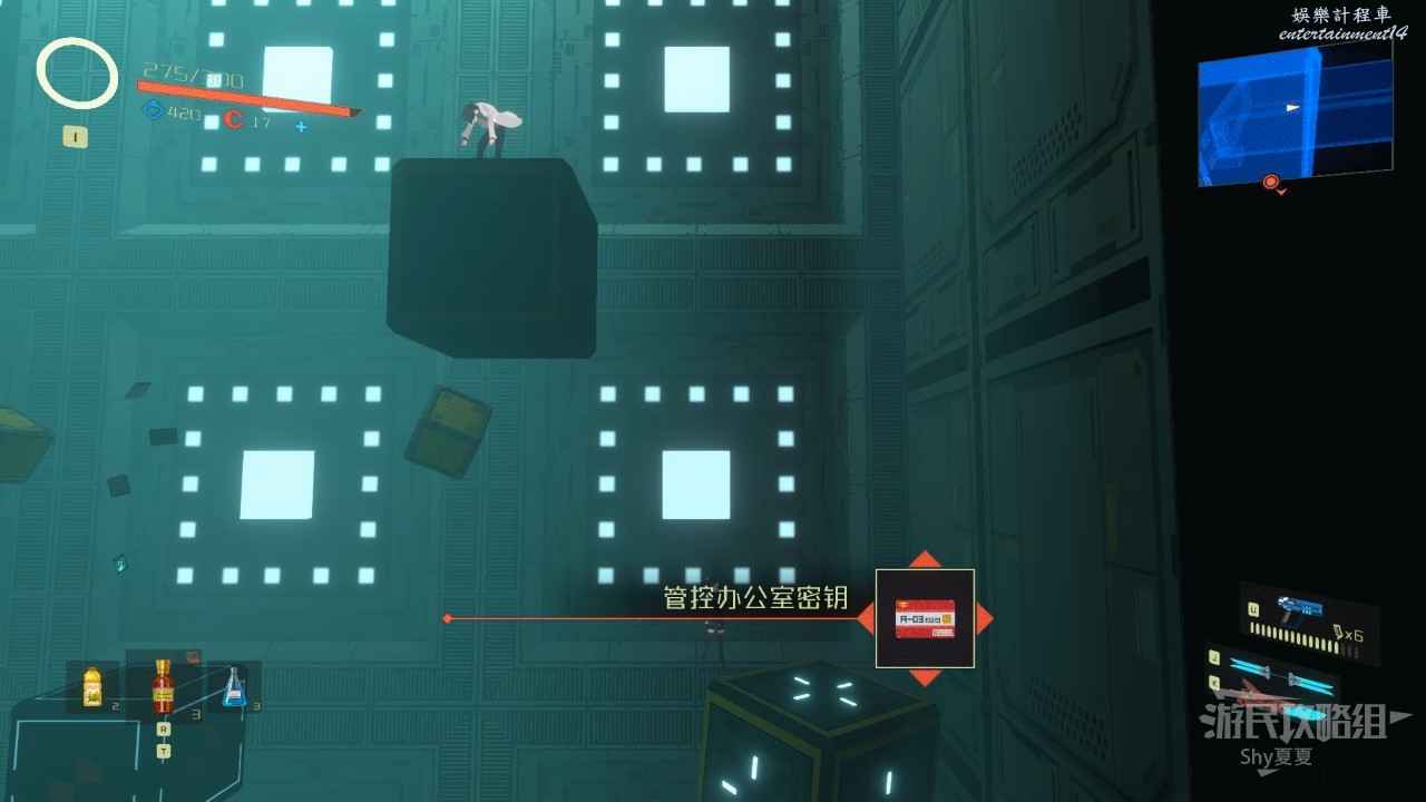 接著來到【重力實驗室】,這裡的方塊都是時有時無,我們現在會二段跳加衝刺,後很長的滯空時間,所以如果方塊消失,就利用這兩個技能滯空等一下就好,在這個區域後很多好東西,但都不是關鍵收集品,這裡就不贅述了,在右上角獲得【管控辦公室金鑰】即可。
