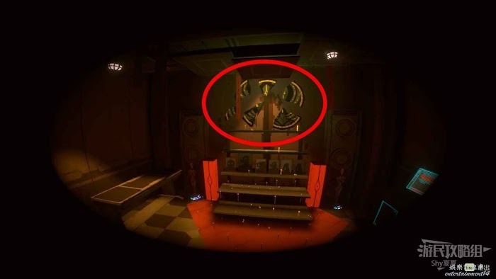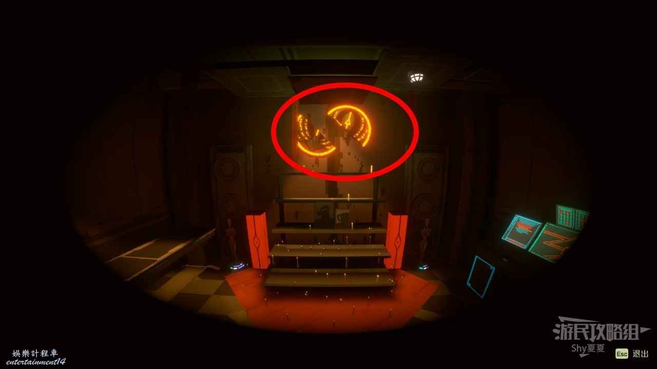 進入門內,進入房間,在屋內可以獲得【招財貓(7/25)】,破解電腦後,這個時候破解電腦有一定難度了,簡單指點一下:先動最下面的圈,讓中上兩個缺口重合,再動最上面的圈讓3個圈缺口重合,最後動中間的圈,讓缺口和鑰匙重合,完成破解。