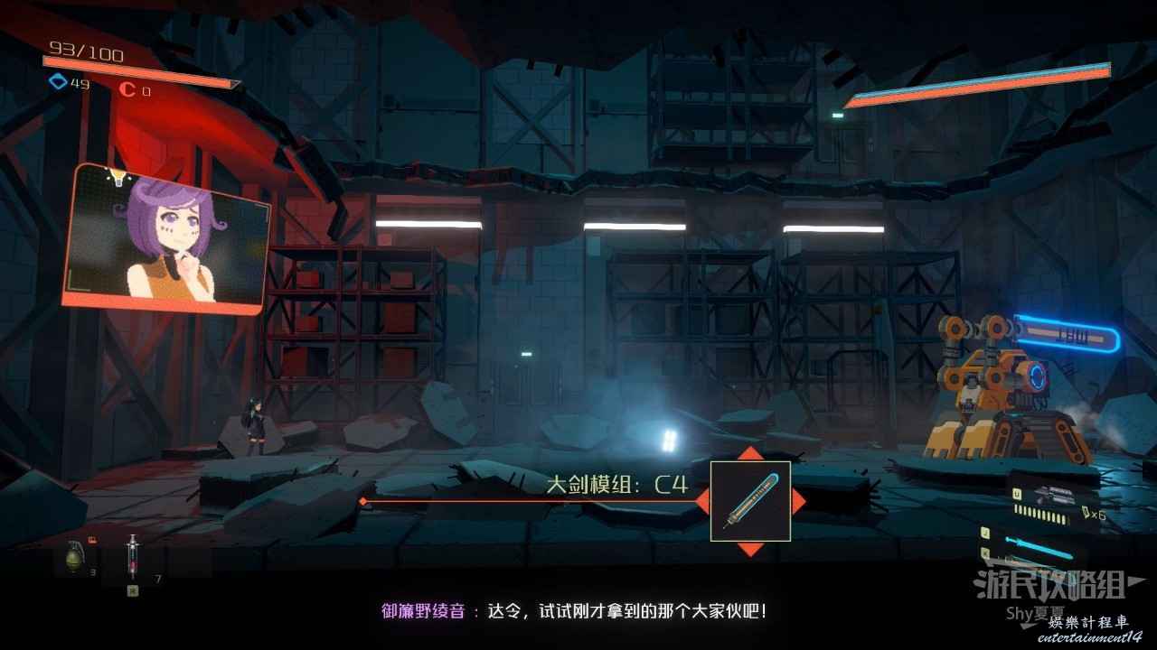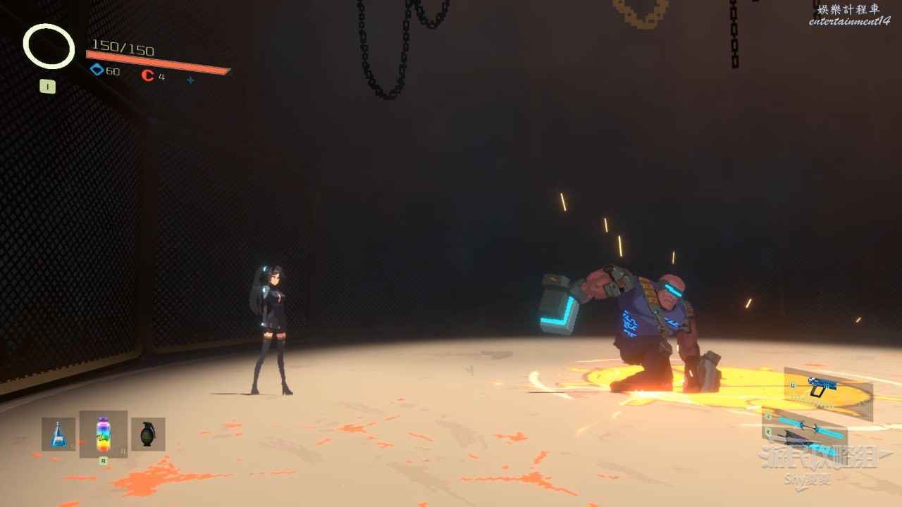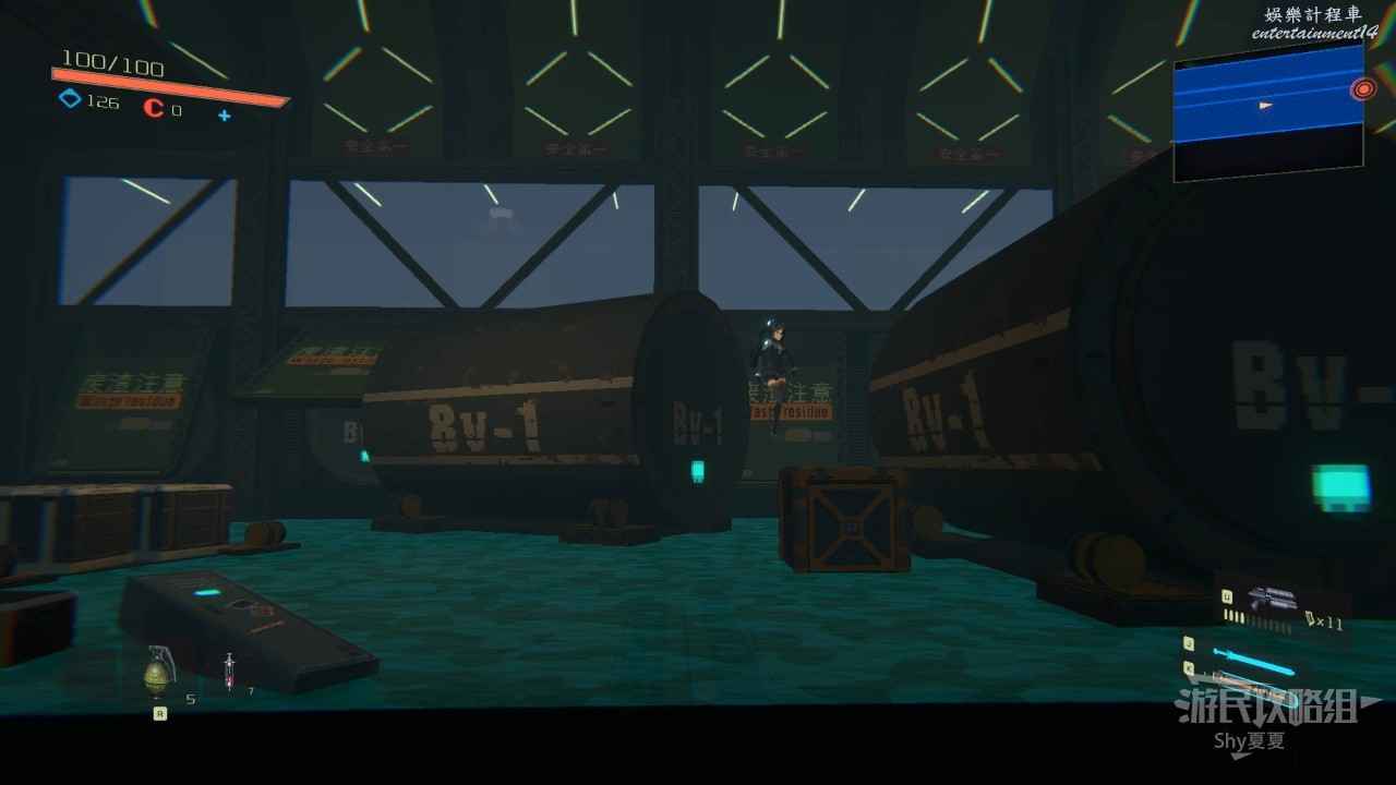 這裡遇到的敵人分別為:測試用槍兵、測試用步兵、重型警備機,簡單點說就是沒有護甲的敵人用單手劍解決,飛行敵人用手槍解決。