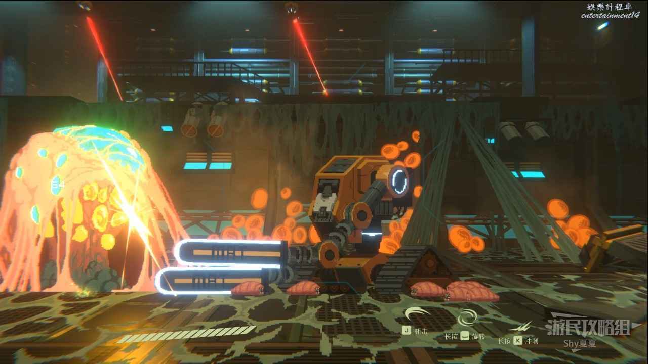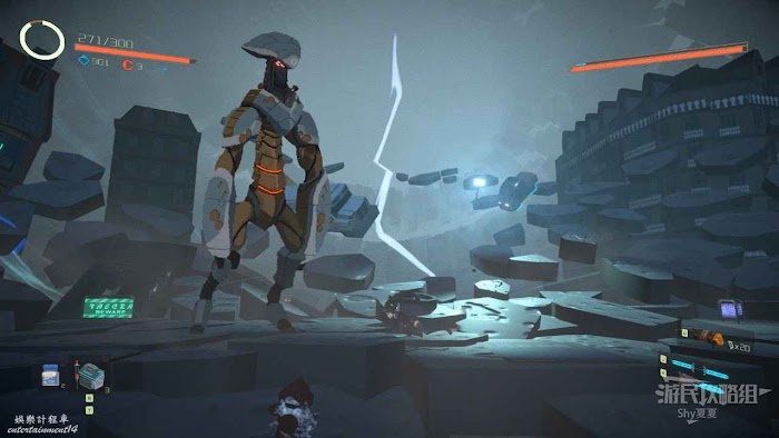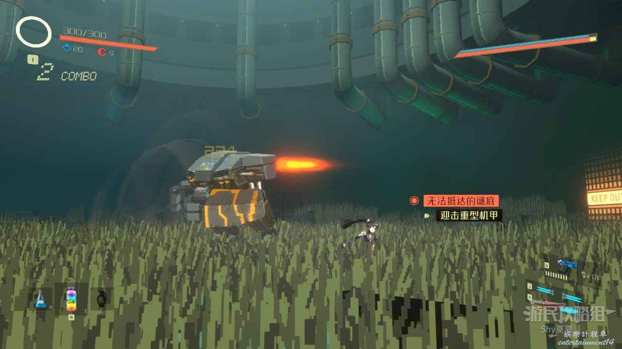 來到一片草叢的地方,會出現很多機甲,如果這個時候有電屬性武器,直接爽翻,亂砍就行,難度不大。