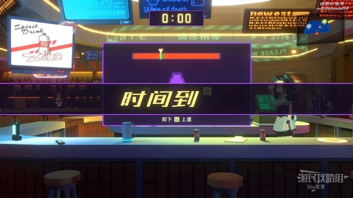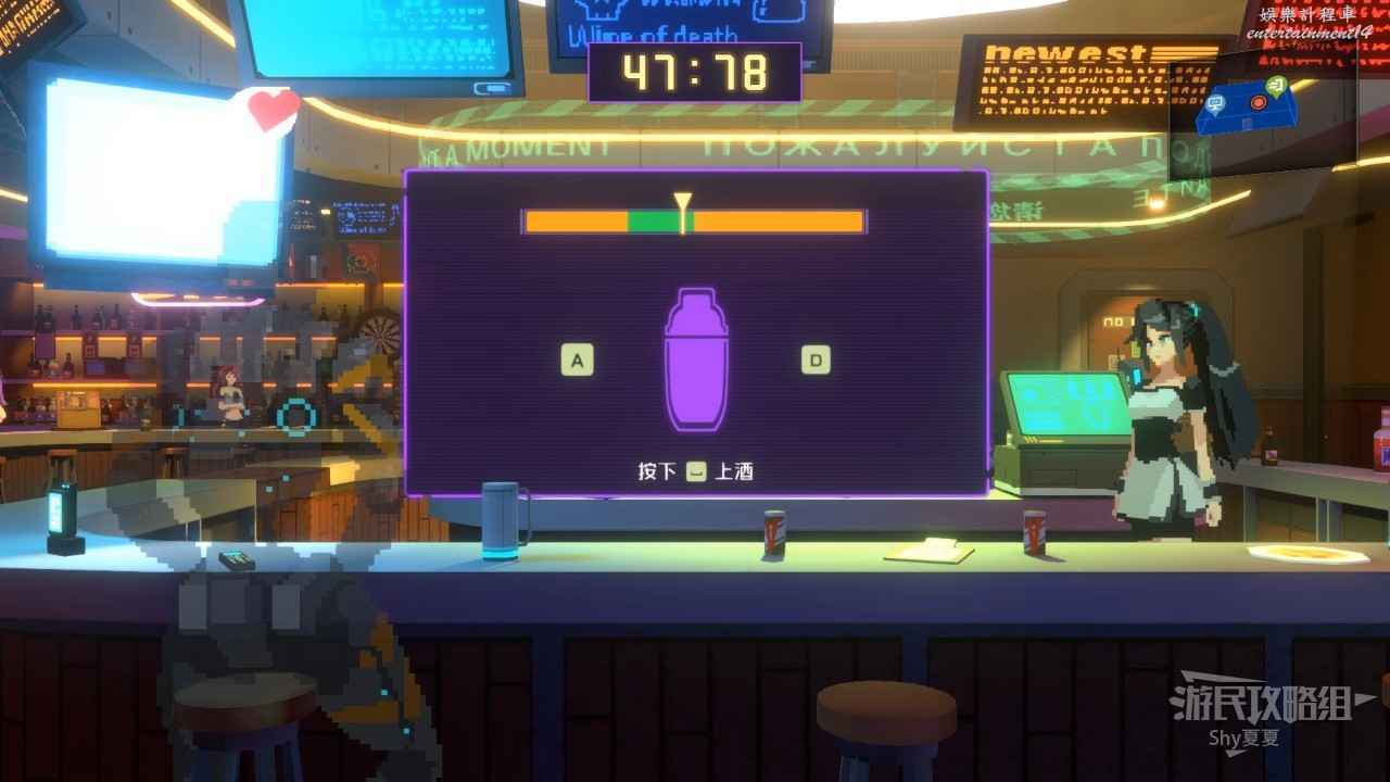 換好衣服去一樓進行調酒操作,非常簡單,第一階段,看數字下的瓶子顏色,選擇下方的酒瓶新增;第二階段,快速左右搖晃,指針就會變慢,在綠色位置停下就調好了。之後有一個成就和這個小遊戲有關,但是現在還不能完成。