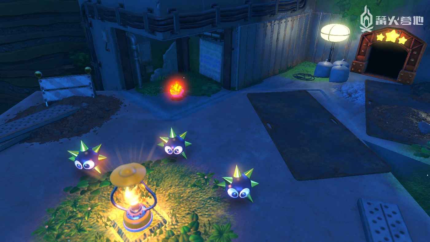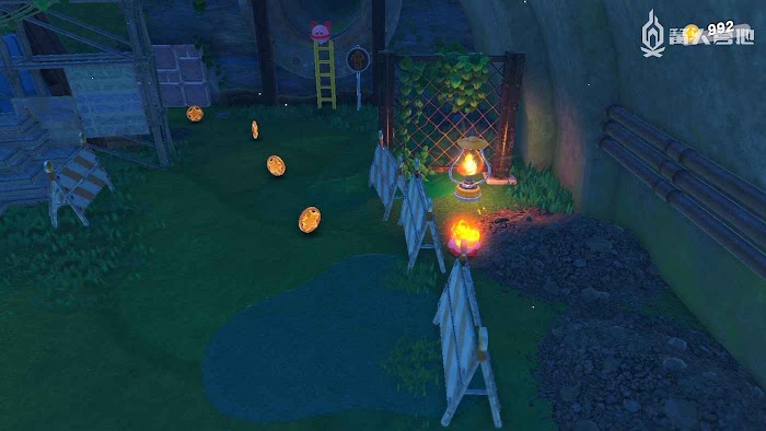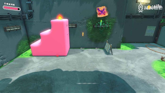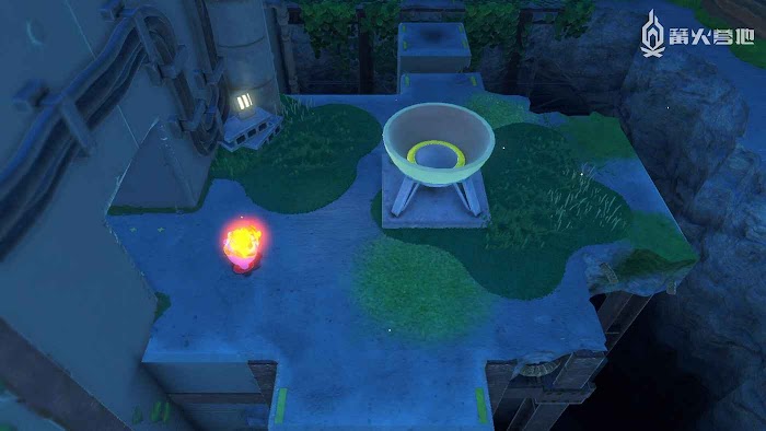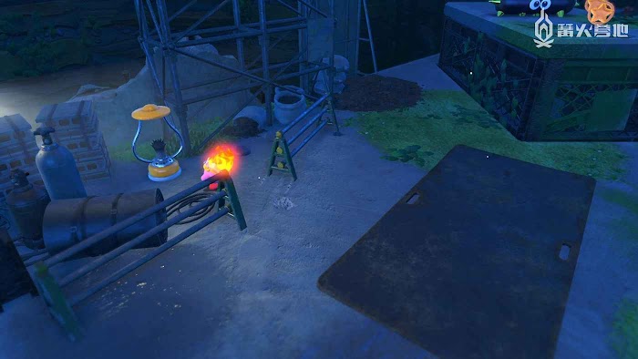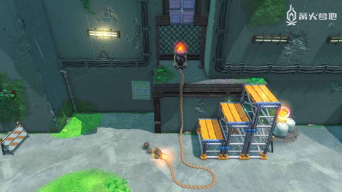 3、進入工廠區域後,地面會有一條燃火線,點燃後以最快的速度到達燃火線終點,乘坐大炮飛上去即可發現。