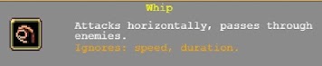 特點是只攻擊水平方向,如果有兩次以上的攻擊次數,會前後前後來回攻擊。並且攻擊位置緩慢向上移動。能比較好的從人群中開闢道路。並且第一次升級就是增加攻擊次數,所以前期使用很不錯。