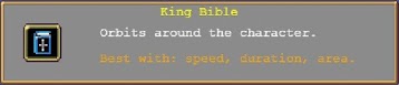 等級提升之後很好用的武器。放出幾本書繞著你旋轉並傷害碰到的敵人。(知識就是力量?)。後期配合複製指環之類的可以一口氣放五六本繞著你轉,敵人根本進不來。