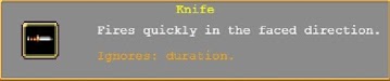 攻擊方式是向你移動的方向直線發射飛刀。對單體傷害驚人。升級後有一定的穿透效果,如果有足夠多的發射數量的話也可以開路。