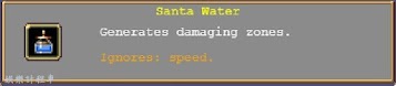 隨機丟出幾瓶聖水留下一片持續傷害的區域。直接理解成燃燒彈也差不多,後期怪多了很有用,配合加射速,加射彈數量,加持續時間的裝備,可以丟出一條隔離帶來阻擋小怪。