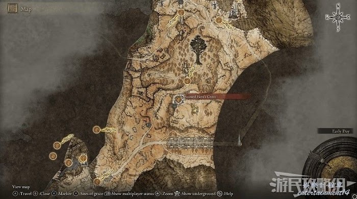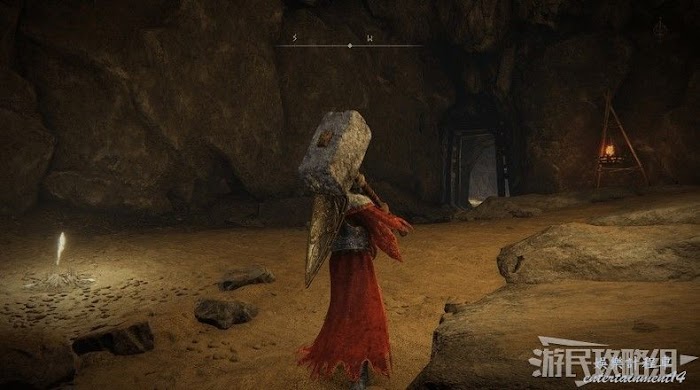 在右邊找到一堵紋理不同的牆壁,翻滾撞開後,往前走打開寶箱可以拿到【盧恩彎弧】,寶箱後邊還有一堵隱藏牆壁,撞開後可以直接進入深根底層,前邊就是賜福“樹根旁斷崖。”