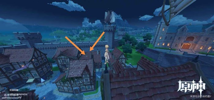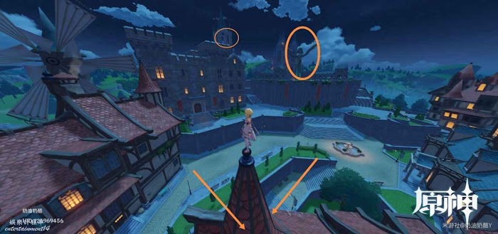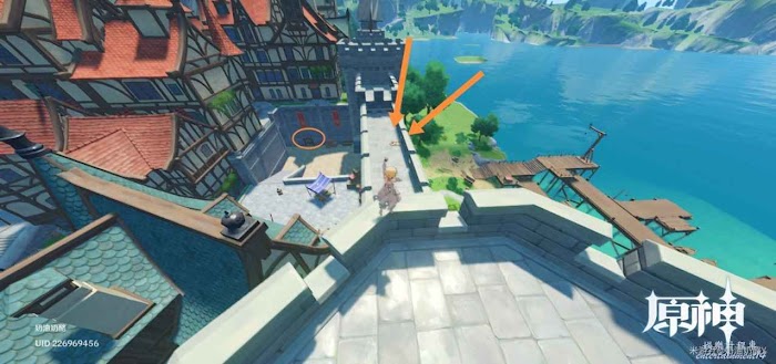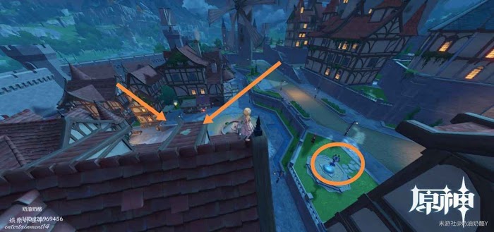 第四個位置 這個位置實在城牆上 圖中圈圈的位置是 蒙德聲望 任務卡的地方 這邊的城牆上就是這最後一個海報的位置。