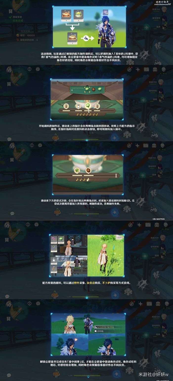 獲得活動玩法提示,簡單來說呢就是找到製作調料所需的材料,按照順序將材料加入即可獲取調料,把調料加到「美味的」料理裡,就可以去壺裡邀請角色試吃,不同角色會根據自身喜好做出不同反應