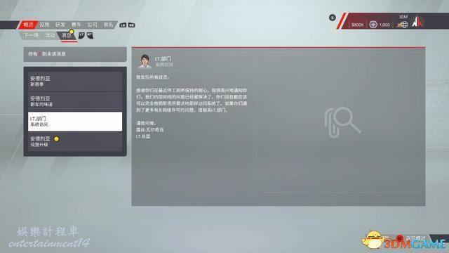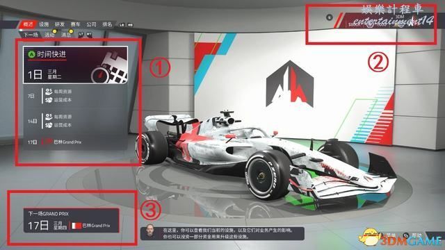 在車隊功能表的主頁,可以查看當前的時間線(注1)、當前資金與研發點數(注2)和下場比賽日期(注3)。