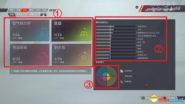 在研發介面,可以查看當前已研發的項目數量(注1)與各大車隊的車輛性能對比(注2)。