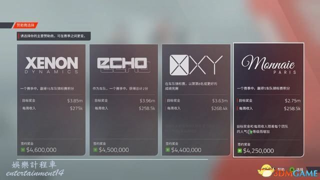 選擇贊助商(起始資金)的時候會有所差異,不同贊助商對車隊的要求不盡相同。